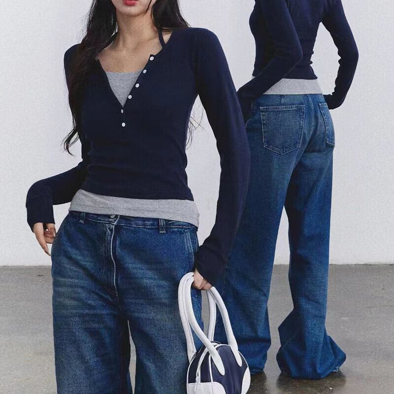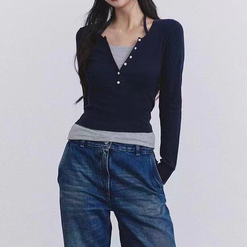 長袖 Tシャツシンプルスリムパッチワークエドクロップドストリートオールマッチトップスシック Y2k グランジ ロング