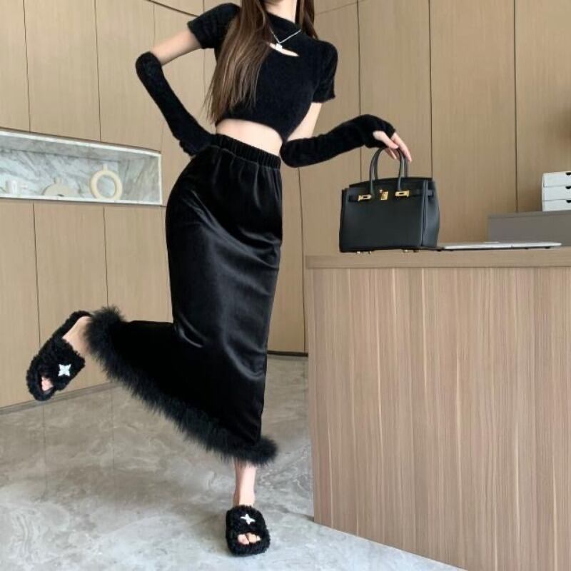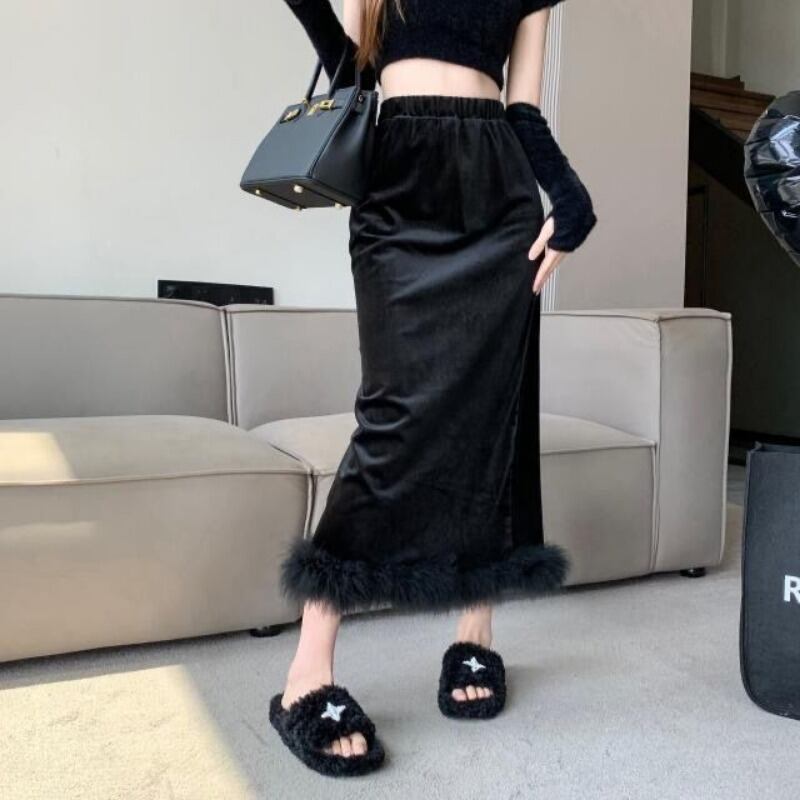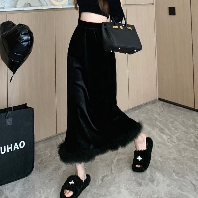 ウエスト黒ベルベットスカートロング Y2k 服グランジ羽尻段段段段ペチコートスカートレトロ秋 ブラック オータム 秋物