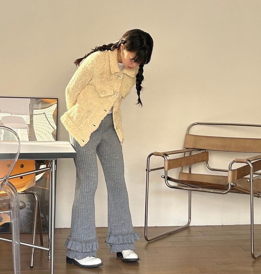 ワイドレッグパンツボトムスウエストストレートパンツニット Y2K パンツフリル折り目因果ズボングレー ラッフル ワイドパンツ