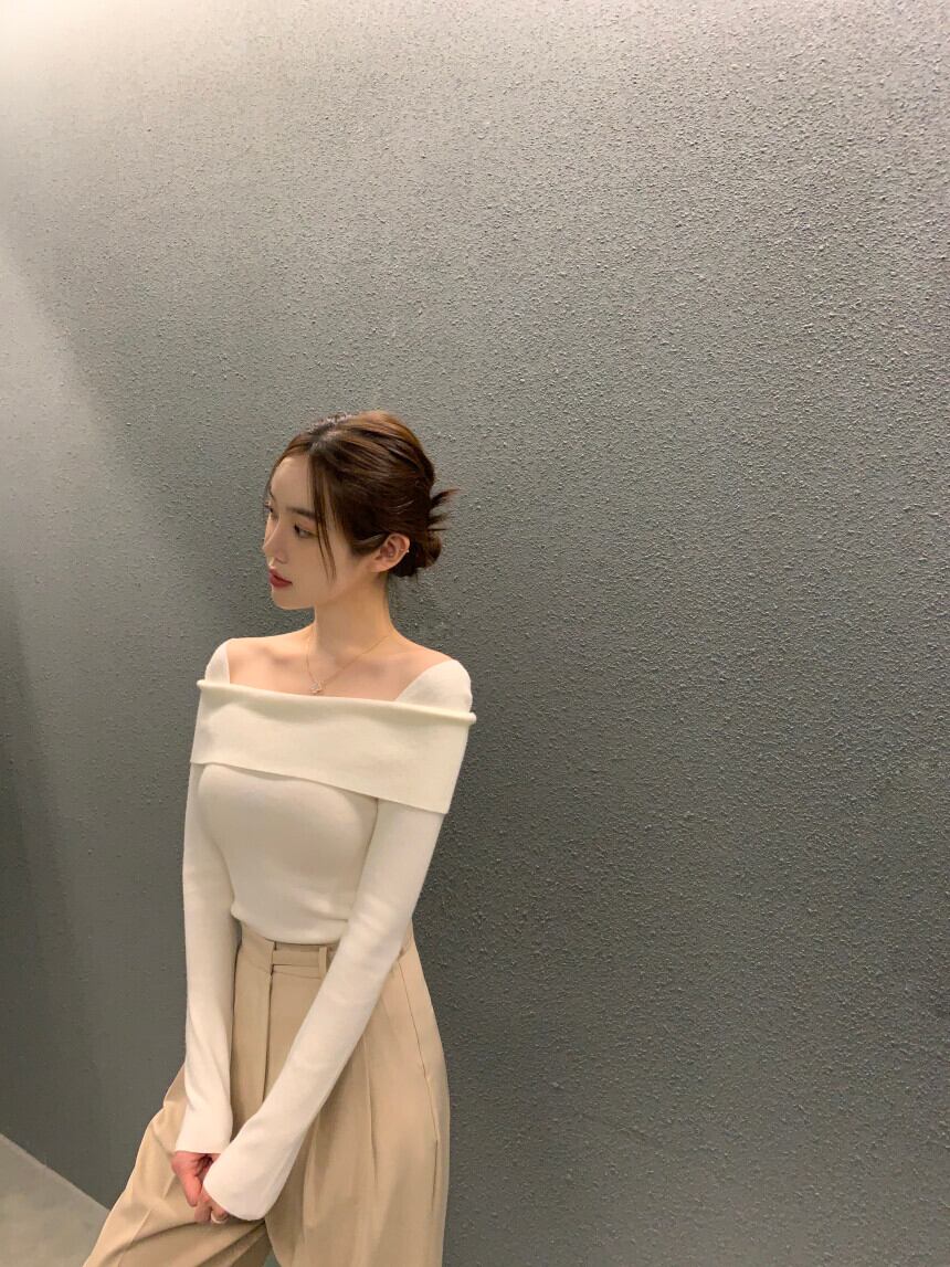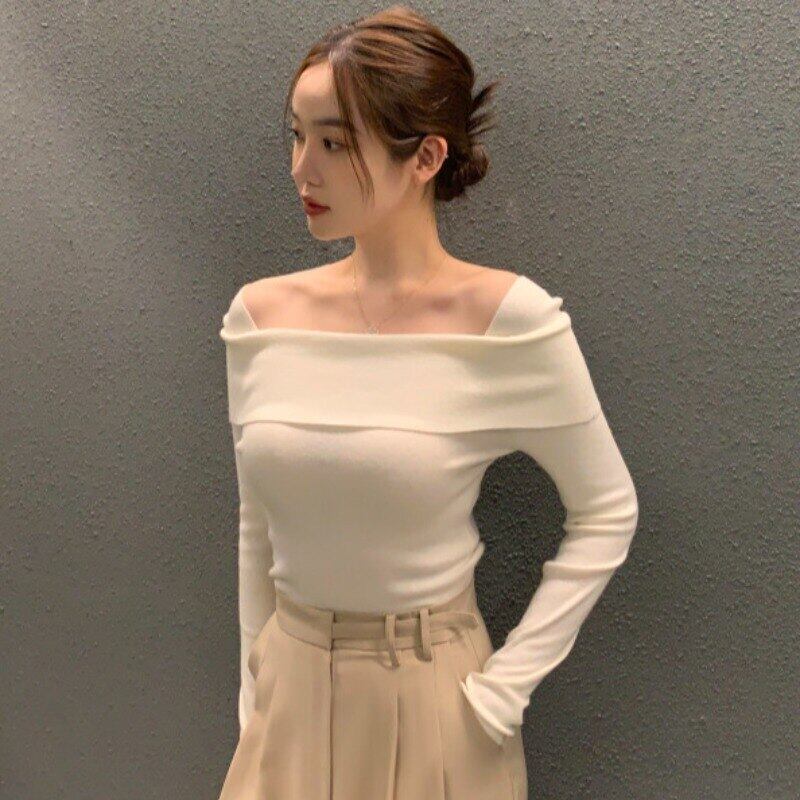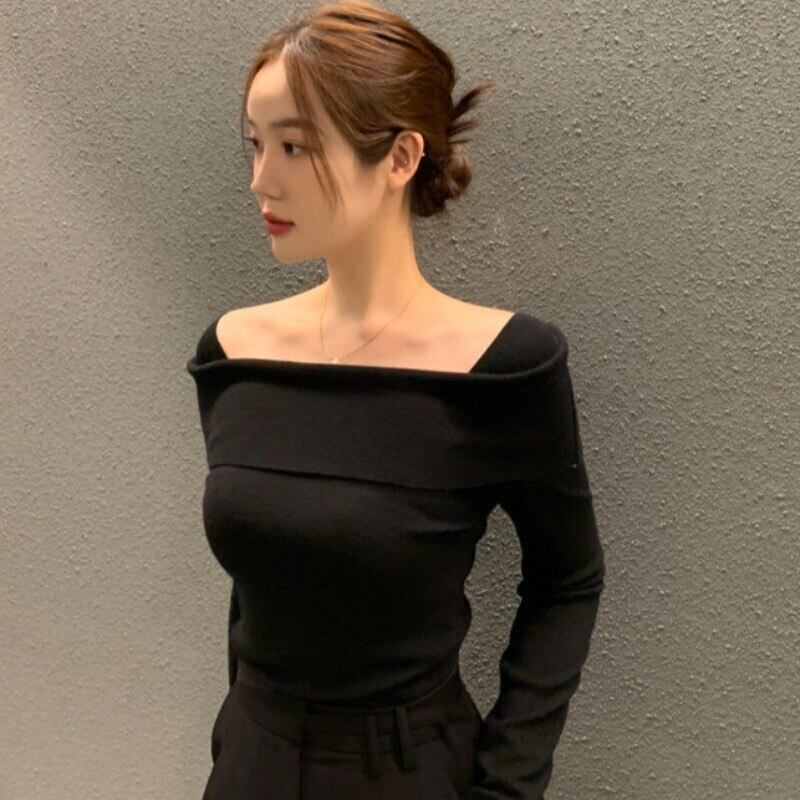 セーターボトムオフショルダースリムフィット長袖シャツプルオーバーセーターブラックホワイトニットトップ ロング