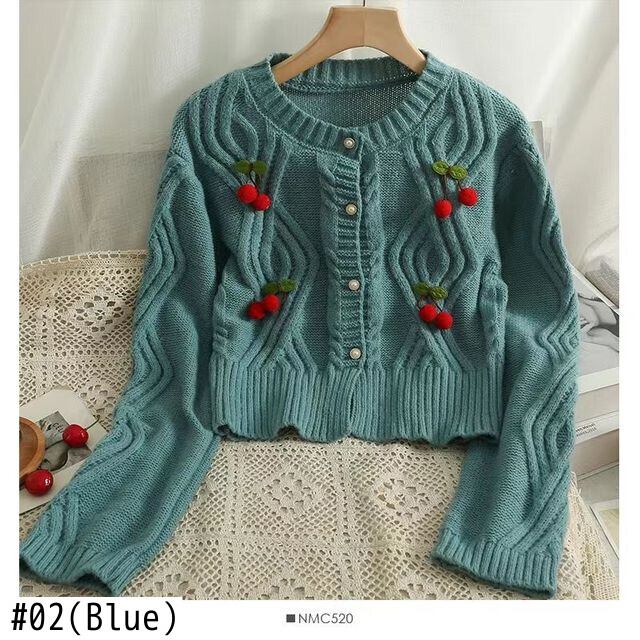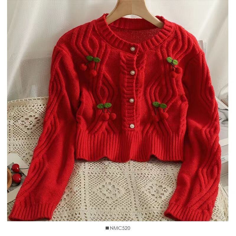 クロップド カーディガン ショート ツイスト セーター コート ルーズ スウィート チェリー ニット カーディガ トップ セーター デ プル 大人ガーリー キュート カジュアル