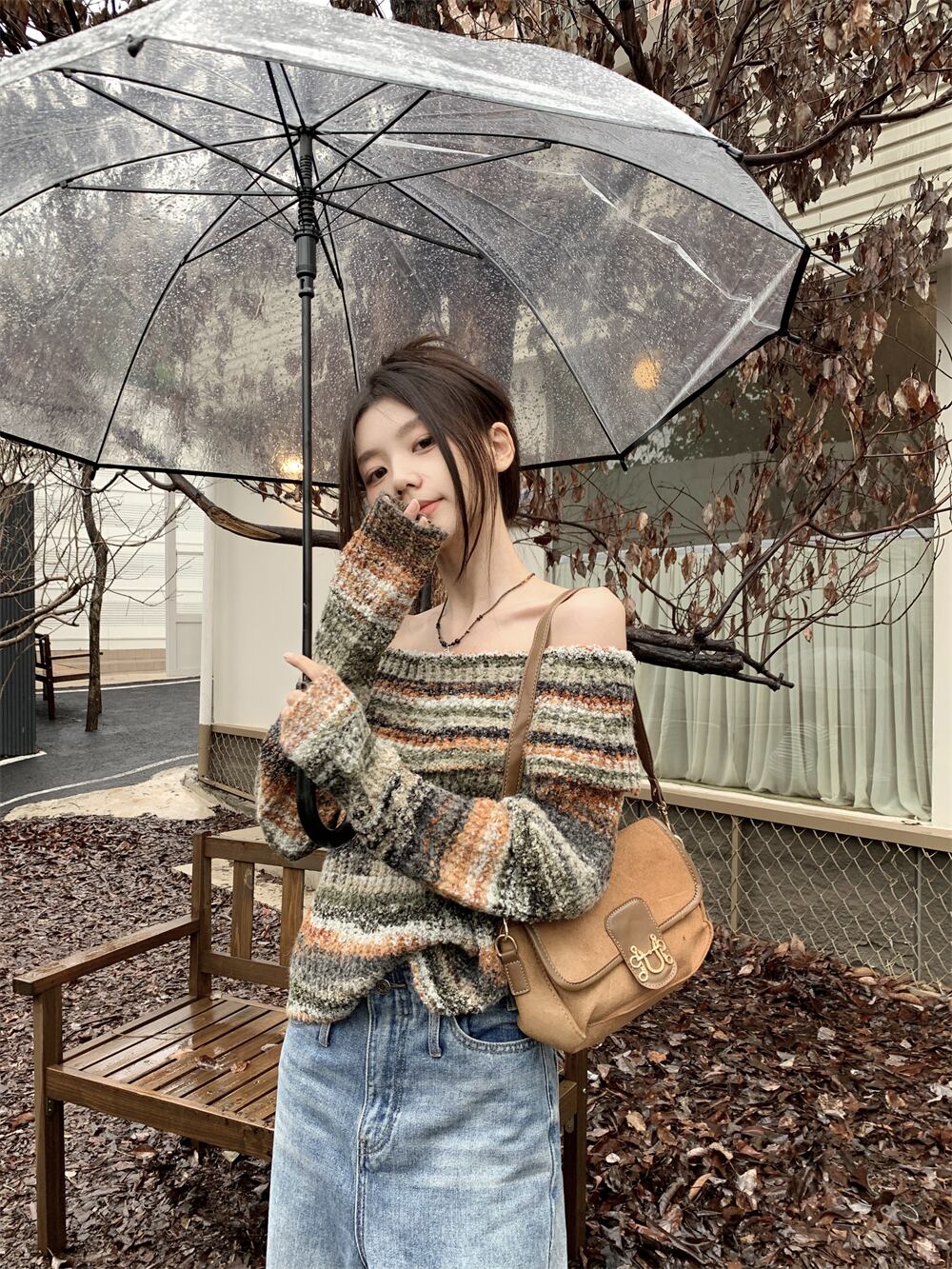 怠惰オフショルダートップ春スパイシーガールレトロシックオフショルダーセーターセーター Y2k 服妖精プルオーバーセーター スプリング 春物
