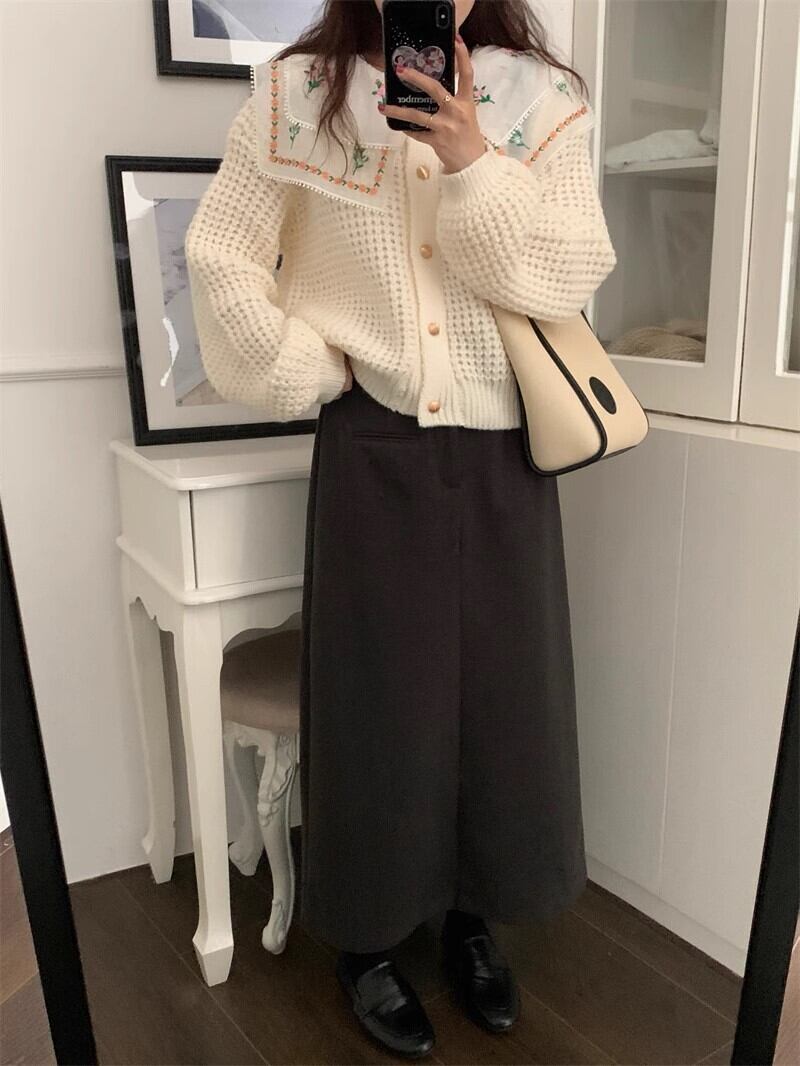 ドールネック刺繍セータープルスイートセーター花柄クロップドカーディガンコートトップスピンクカーディガン 大人ガーリー スウィート キュート カジュアル