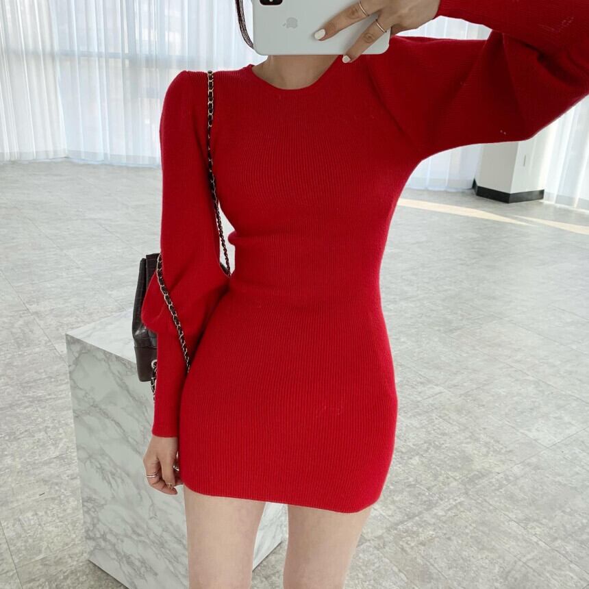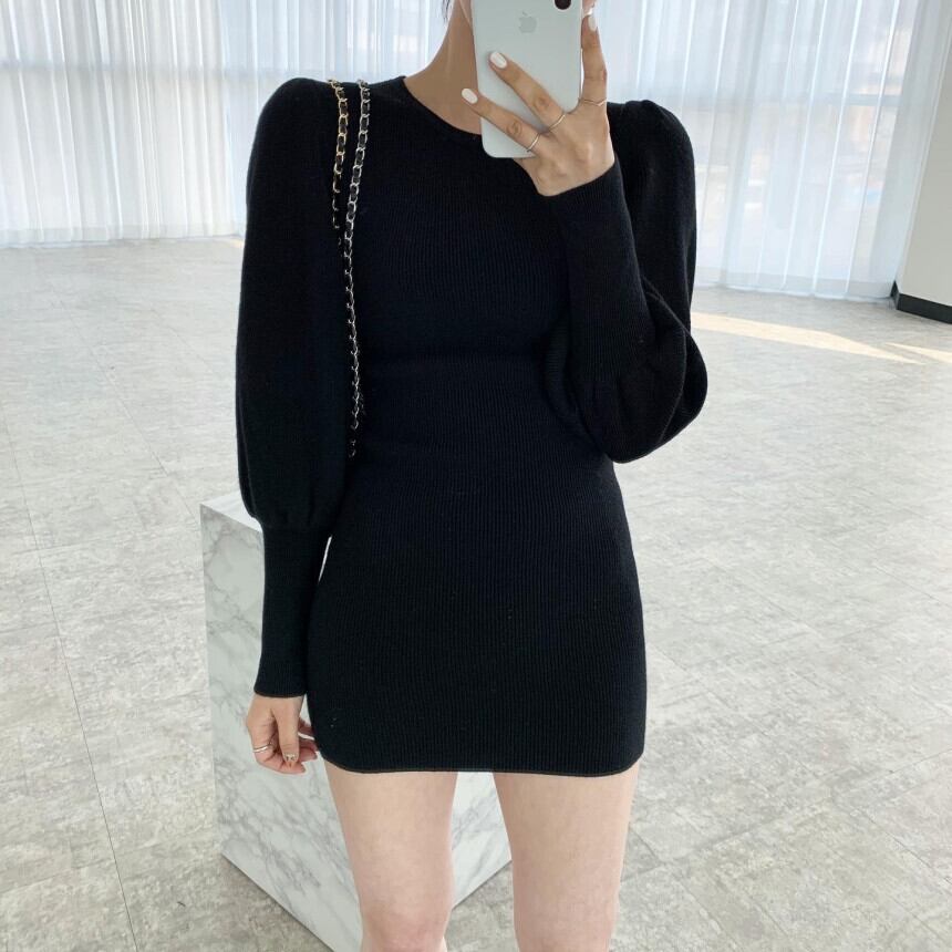 スリムジャージミニランタンスリーブニットヒップラップドレス黒セータードレスセクシーレトロローブ Y2k 赤 Vestidos レッド ブラック
