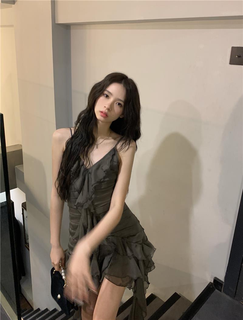 ese セクシーダークノースリーブ V ネックドレスカスケードフリル非対称ローブ原宿夏キャミソールドレス ラッフル かわいい サマー 夏物 Vネック