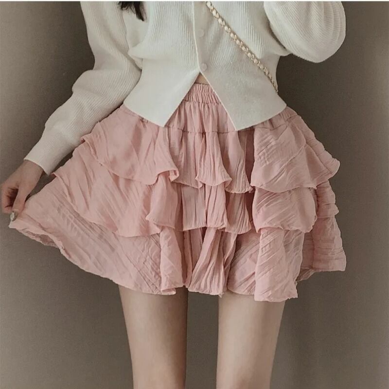 スカートペチコートスタイルスリム二重層ピンクケーキスカートフリルミニ甘いファルダ白シフォンスカート ホワイト 大人ガーリー スウィート キュート カジュアル