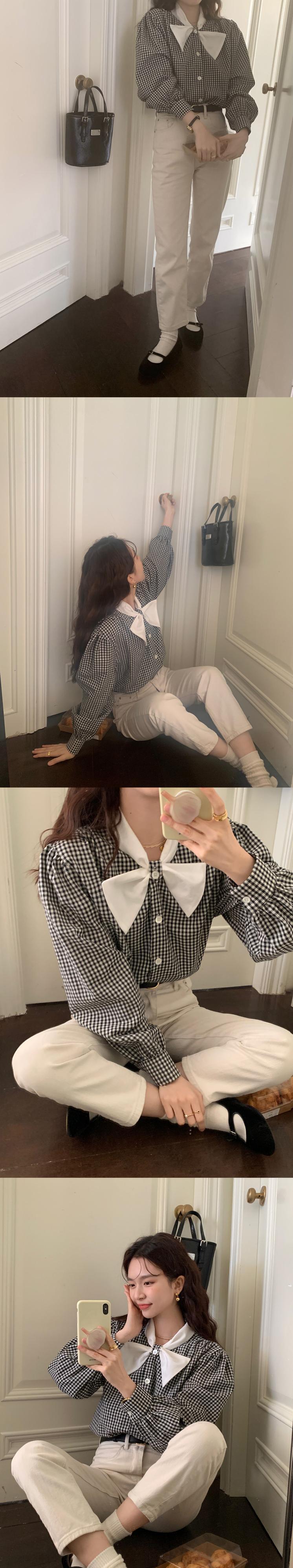 春スタンドネックボウコントラスト長袖チェック柄シャツデモーダブラウストップルーズシャツ ロング リボン スプリング 春物