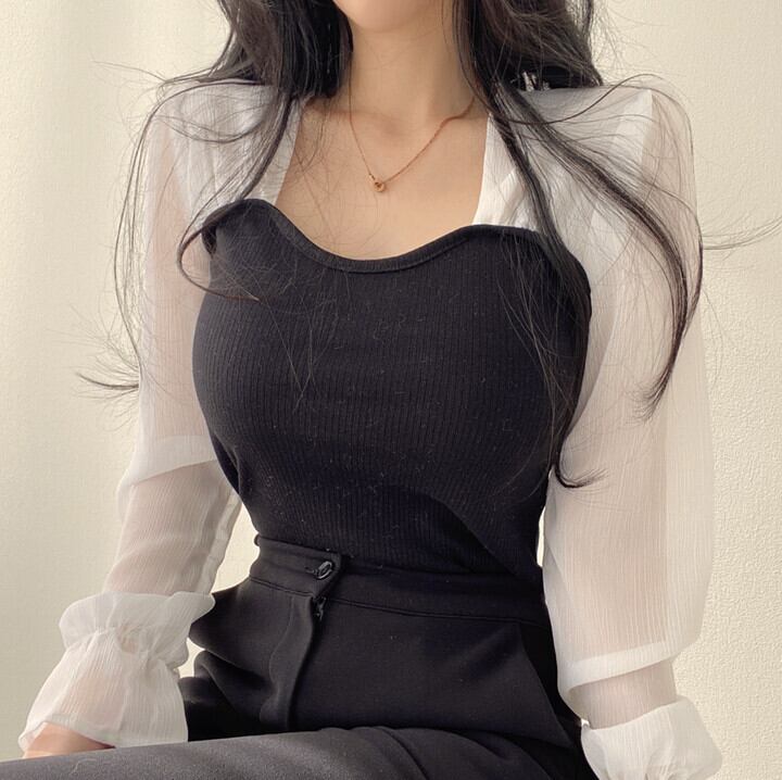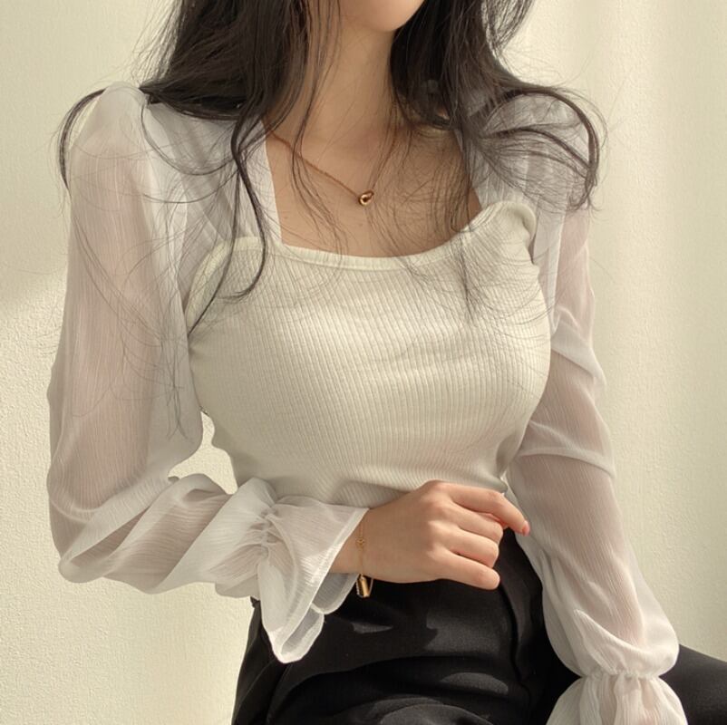 シャツスリムスクエアネッククロップトップグランジ Ropa グラフィック Tシャツニットブラックホワイトシフォンシャツ Tシャツ スクウェア