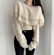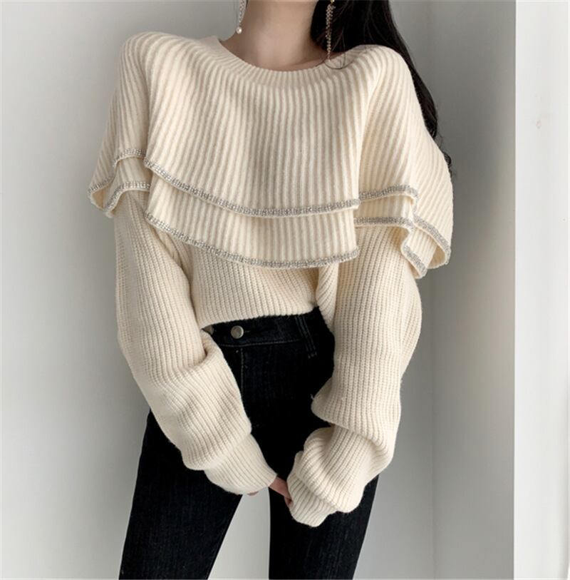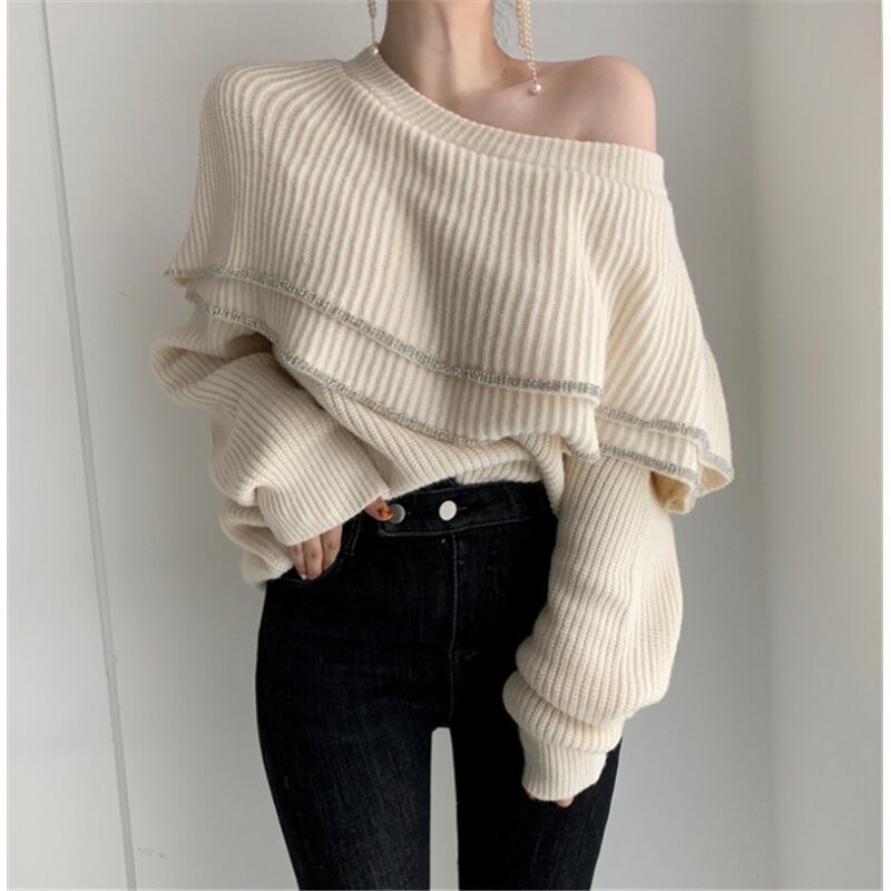 オーバーサイズ セーター 二層フリル コントラスト オフショルダー ルーズ ブラック 長袖 ニット セーター Y2k トップ ロング