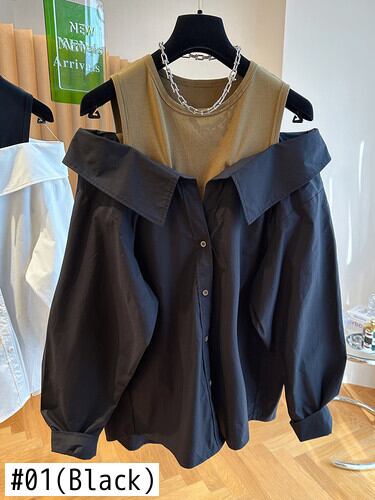 オフショルダールーズベストセクシーパッチワーク Y2k 長袖シャツフェイクツーピーストップブラウスシャツコート ロング