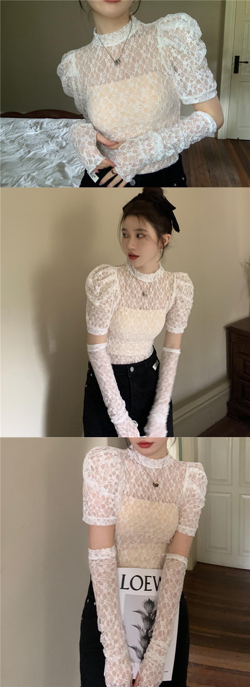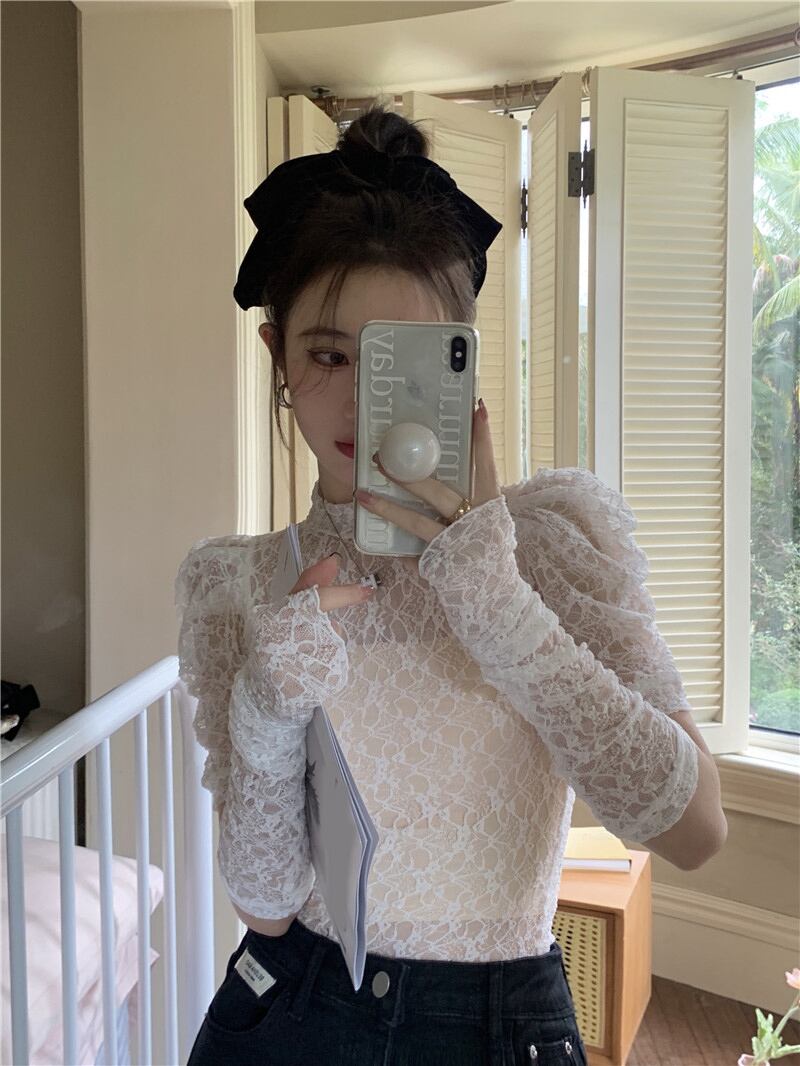 ブラウスレースレトロフレンチスタイルシースルースタンドカラーシックホリデーパーティートップストリートシンプル Y2k