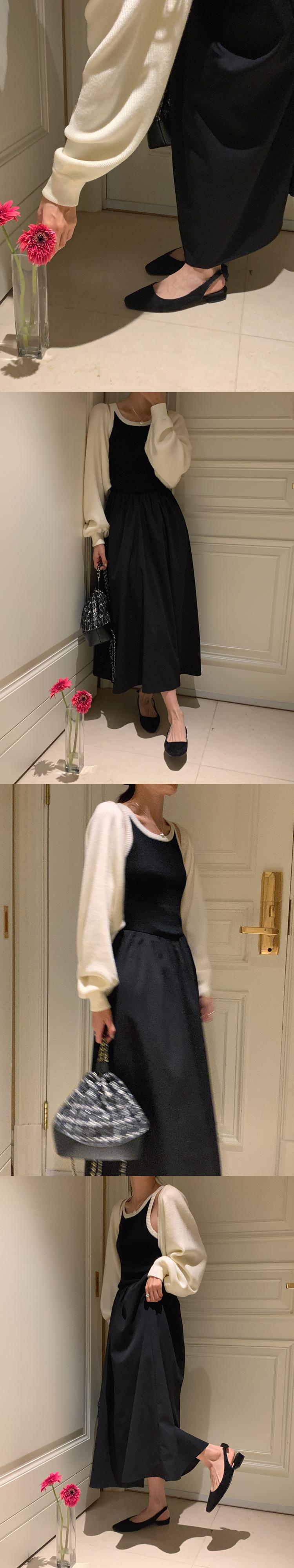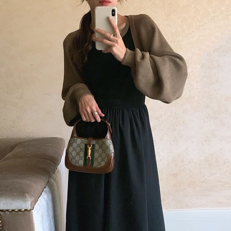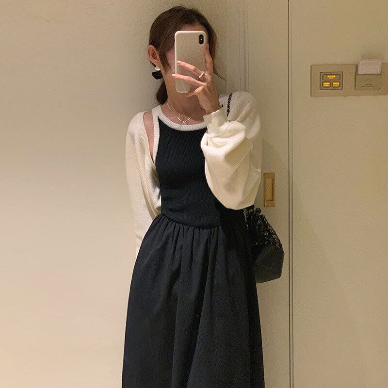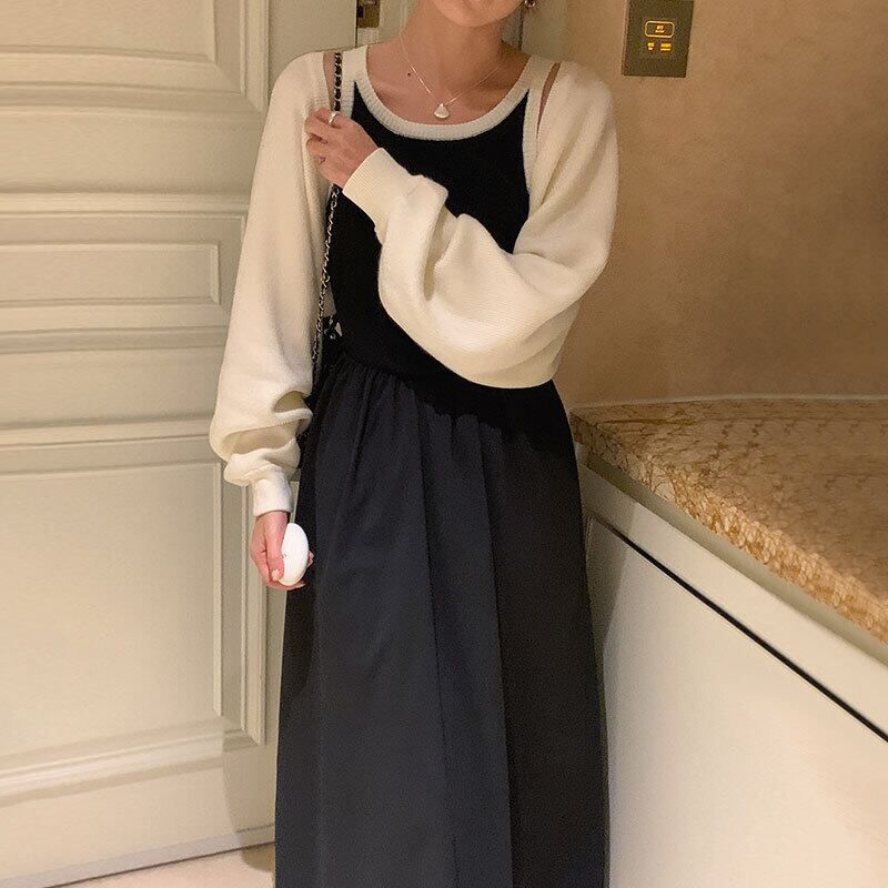 半袖ニットカーディガンコート Y2k トップコントラストボトム黒ベストドレス 2 セットクロップドセーター ショート ブラック ハーフスリーブ 2セット