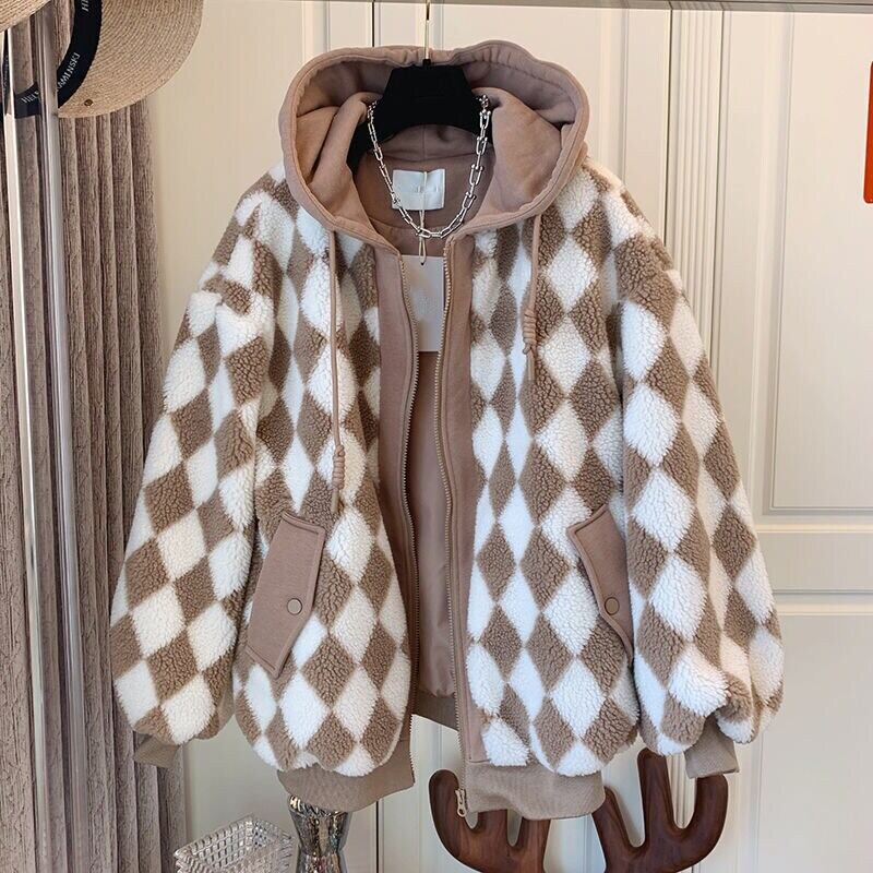 ルースフェイク 2 フード付きジャケットダイヤモンド黒市松コートラムウールスウェットパーカー ブラック シャツ