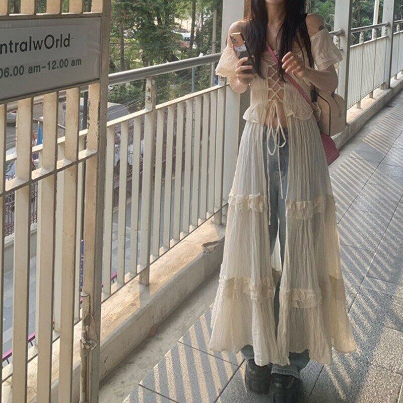 Vestidos サマードレス包帯甘いフリルローブチュニックマキシドレスレース ラッフル 大人ガーリー スウィート キュート カジュアル 夏物