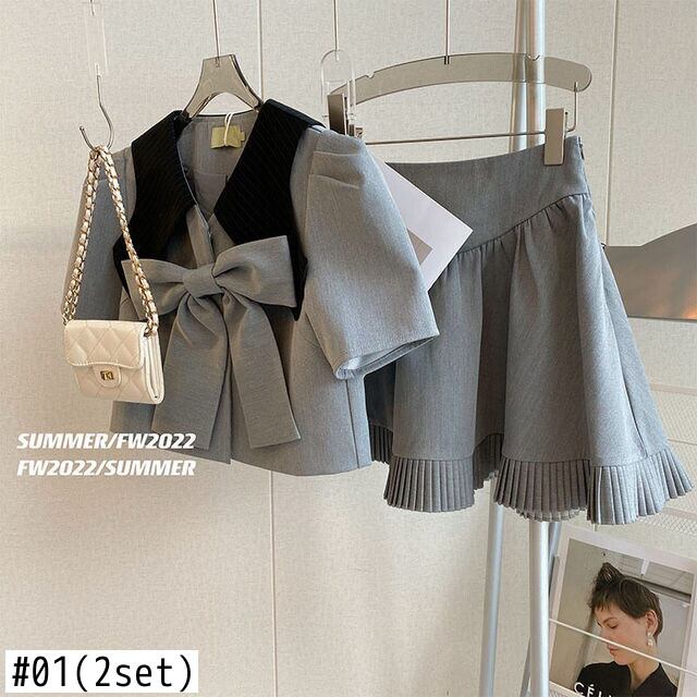 スカートスーツミニプレッピースタイルグレープリーツスカートセット Y2k 弓半袖ブレザーレトロシャツクロップジャケット ショート リボン ハーフスリーブ