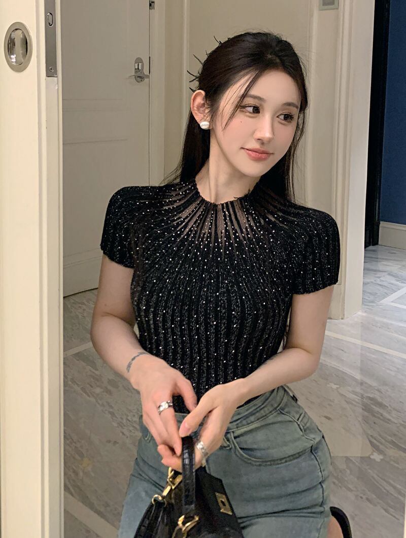 シャツダイヤモンドフィッティングクロップトップスパイシーガール中空アウト半袖 Tシャツニットウェアグラフィック Tシャツ Y2k トップ黒 ショート ブラック ハーフスリーブ