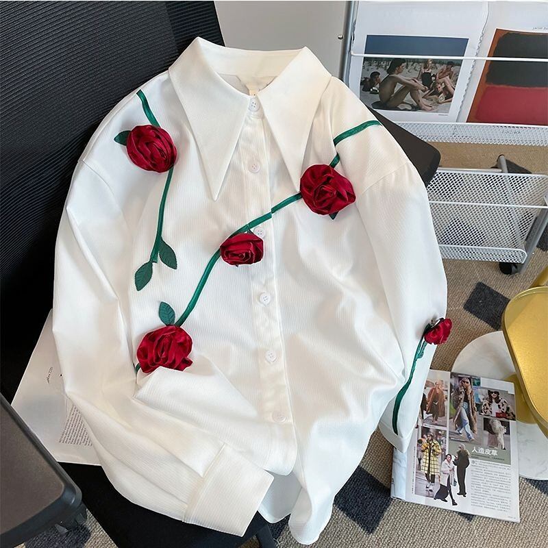 シャツシックアップリケスタイルオフィスレディ春オールマッチ甘いトップストレンディシャツ 大人ガーリー スウィート キュート カジュアル スプリング 春物 会社 学校 通勤や通学にも