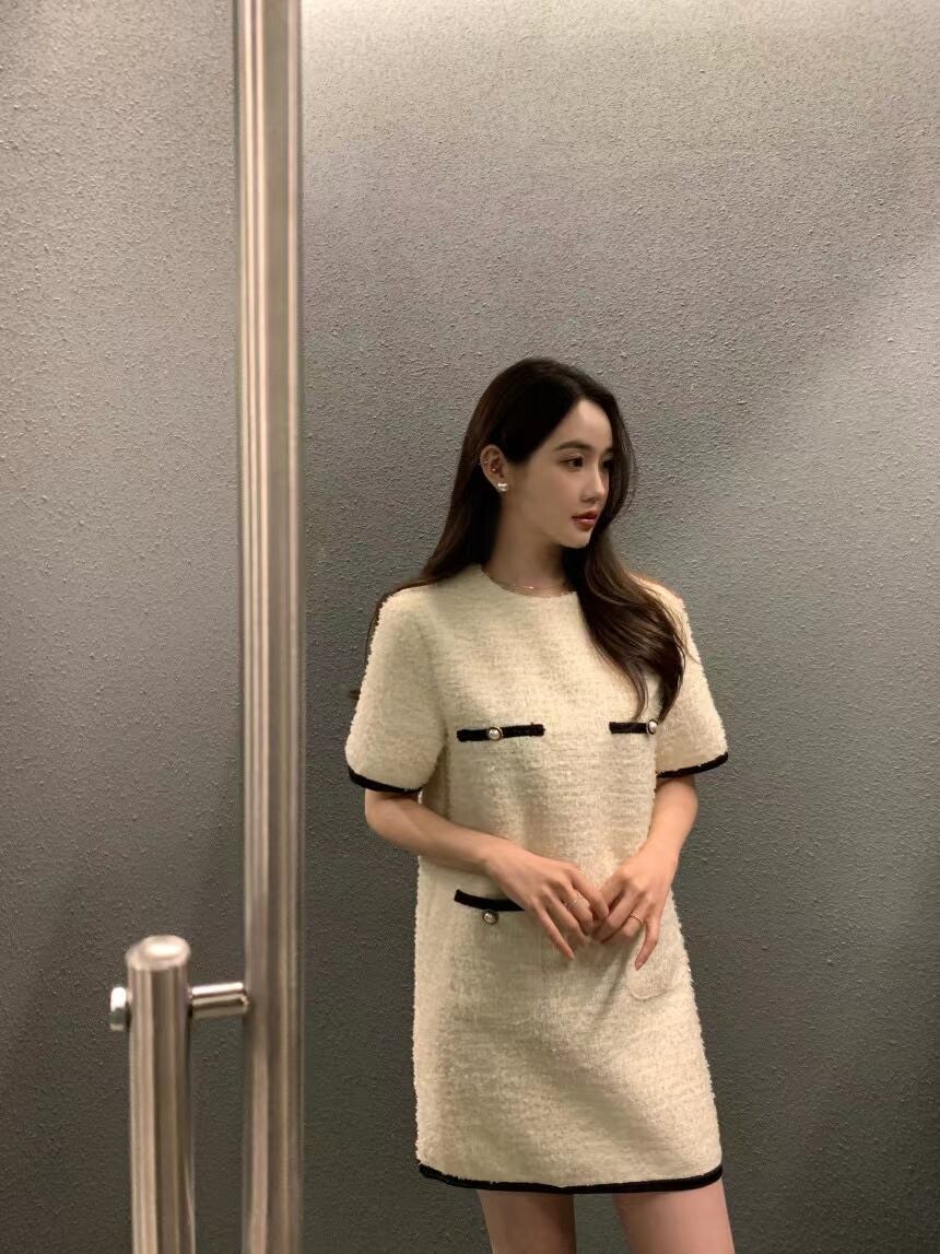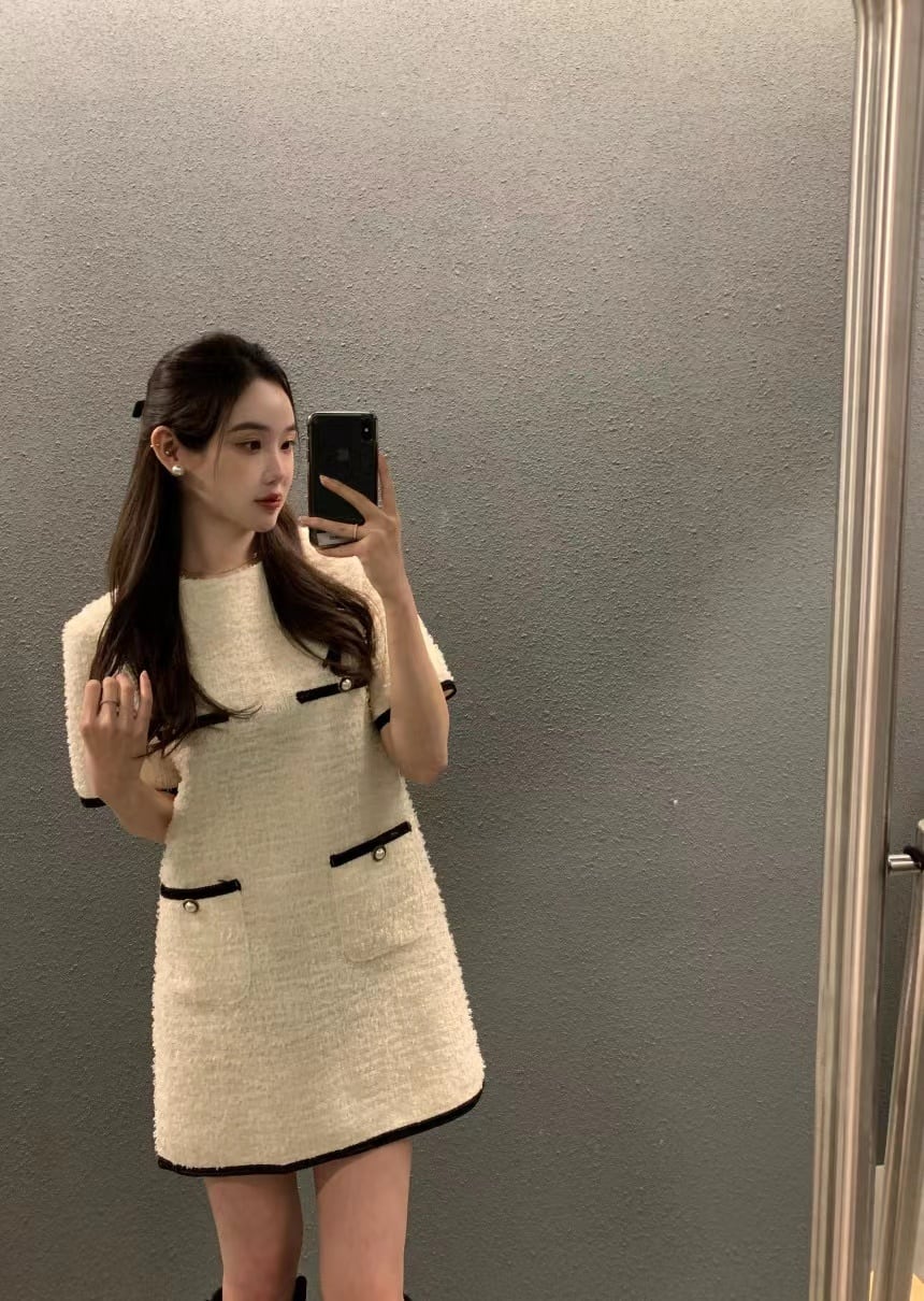ローブ ラウンドネック コントラストカラー パッチワーク ルーズ ブラック 半袖 ツイード ドレス Vestido Feminino Chic ショート ハーフスリーブ Oネック