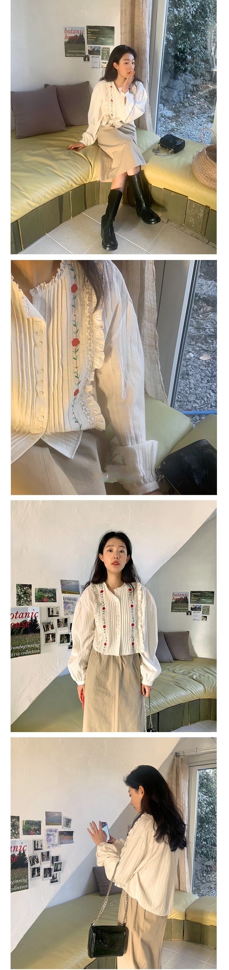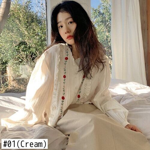 甘い優しい O ネック花刺繍プリーツパッチワークシャツルーズパフスリーブブラウス春トップス 大人ガーリー スウィート キュート カジュアル スプリング 春物 Oネック フラワーデザイン