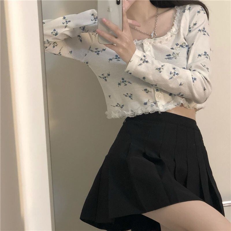 クロップドシングルブレストカーディガンスリムレースシャツ美的フリル花トップスグランジシャツグラフィック Tシャツ 花柄