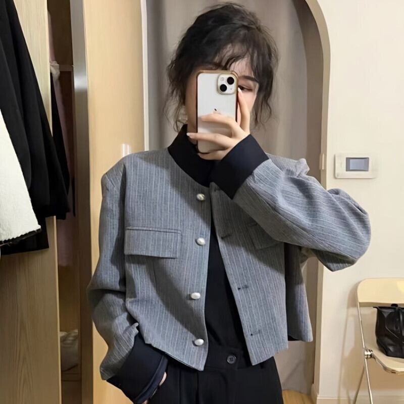 ルーズコントラストグレーストライプテーラードコートブレザー Feminino 秋クロップドカーディガンスタンドカラージャケットブレザー Chaquetas レッド オータム 秋物