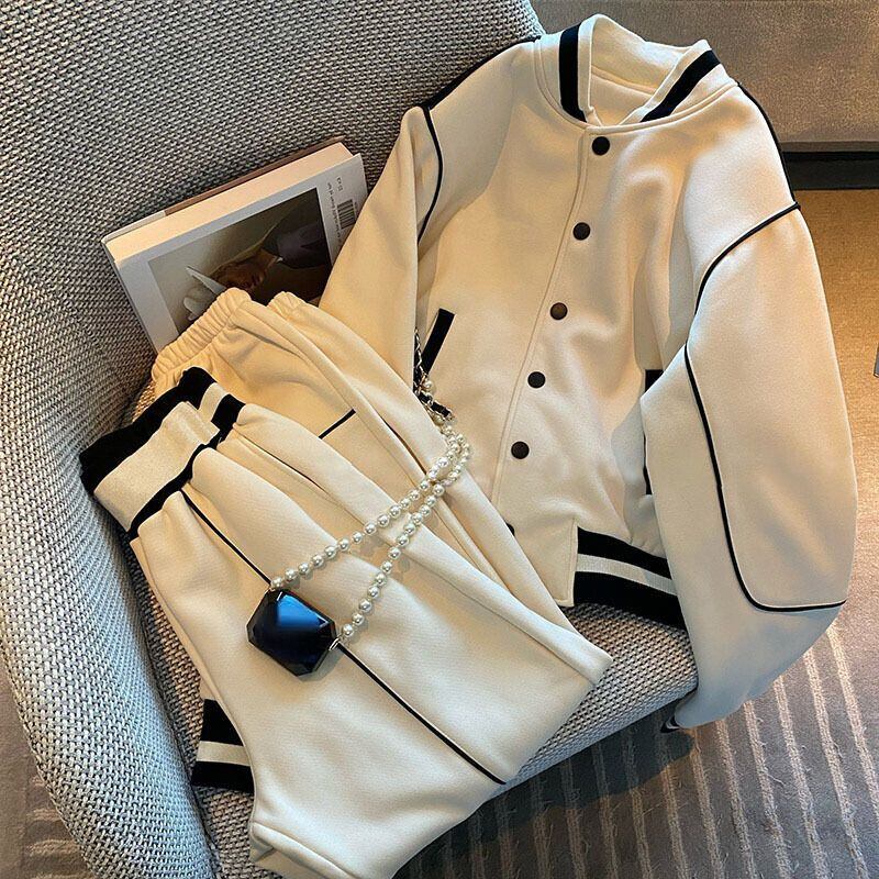 レジャーステッチセット春秋白感覚野球スーツラウンドフットパンツ 2 枚ボンバーコートシック ホワイト スプリング 春物 オータム 秋物