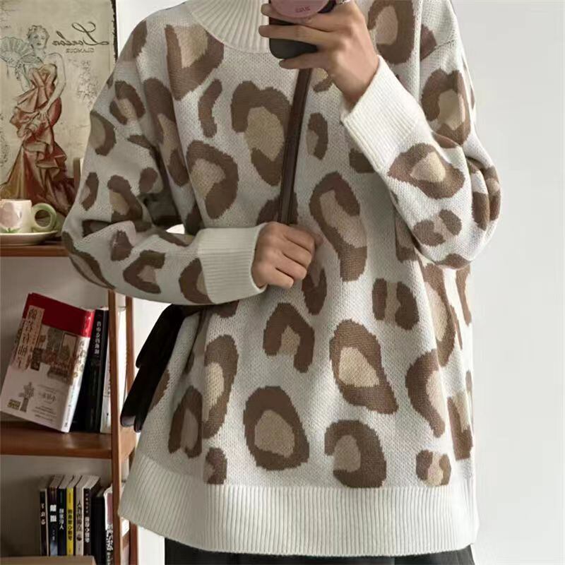 フレンチプリントプルオーバーニットセータープルトップスY2k服セーターデグランジヒョウセーター
