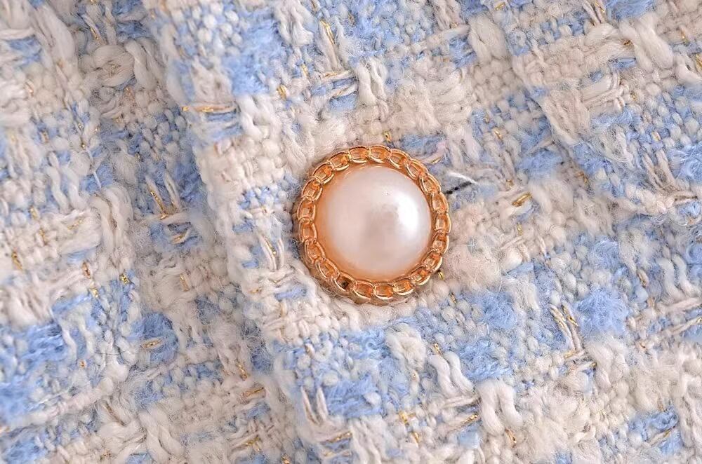 秋フレンチルーズショートスタイル気質トップ小さ香りパールボタンコートブルーツイードジャケットスーツ オータム 秋物 真珠