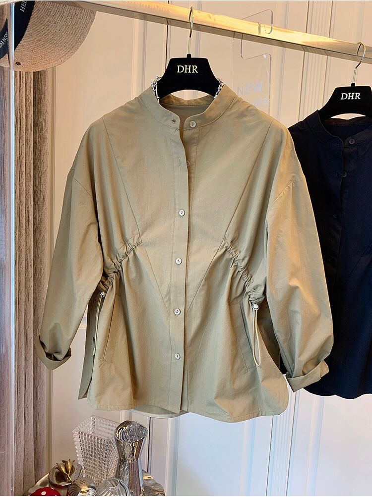 プリーツ巾着ウエストコットン長袖シャツトップショートブラック防風コート送料無料 ロング