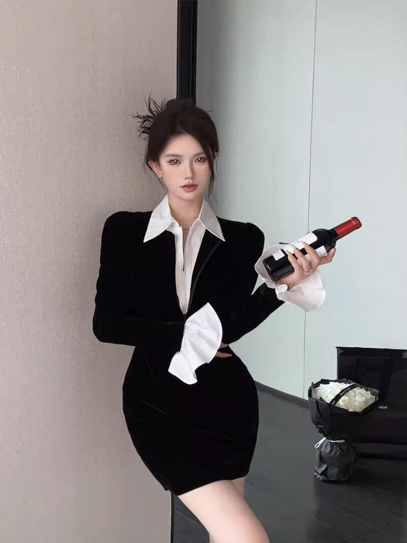 長袖ショートセクシーウエストラップお尻偽 2 パッチワーク黒ベルベットドレス Vestido シャツ Y2k パーティー ロング ブラック