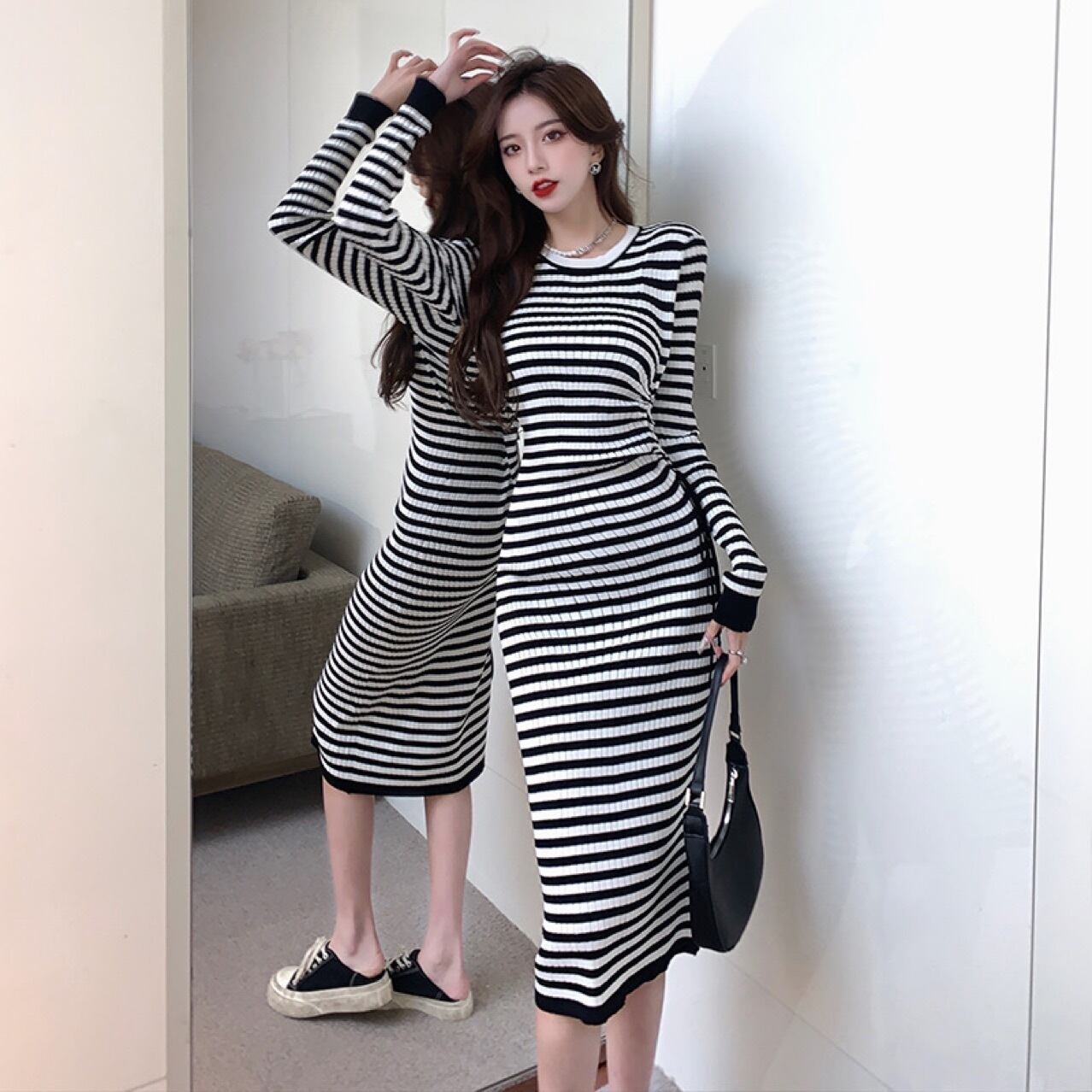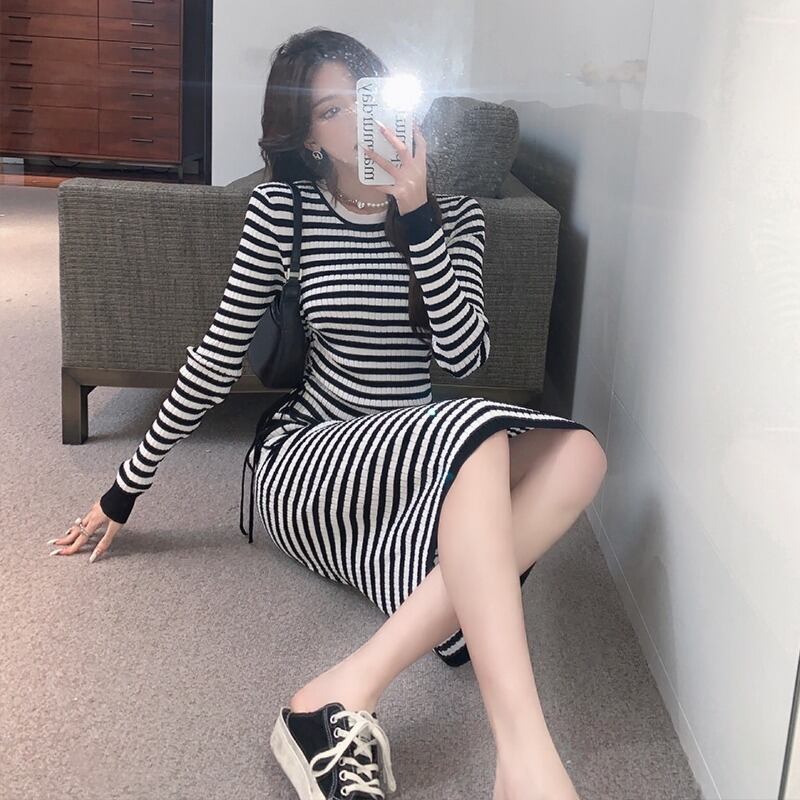 巾着グリーンブラックストライプウエスト長袖ニットドレス春 Y2k ラップヒップセーター Vestidos ロング スプリング 春物