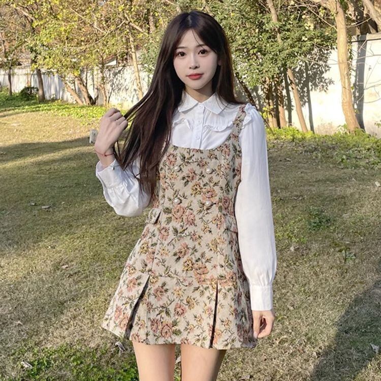 Vestidos デ甘いレトロパーティードレスミニフェイク 2 花ドレスシャツフリル春スリム Y2k ドレス 大人ガーリー スウィート キュート カジュアル スプリング 春物 花柄