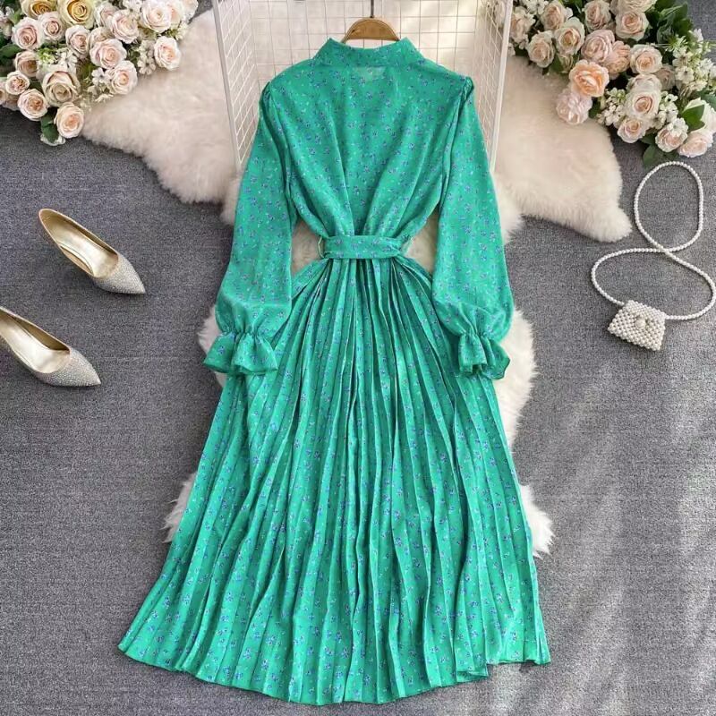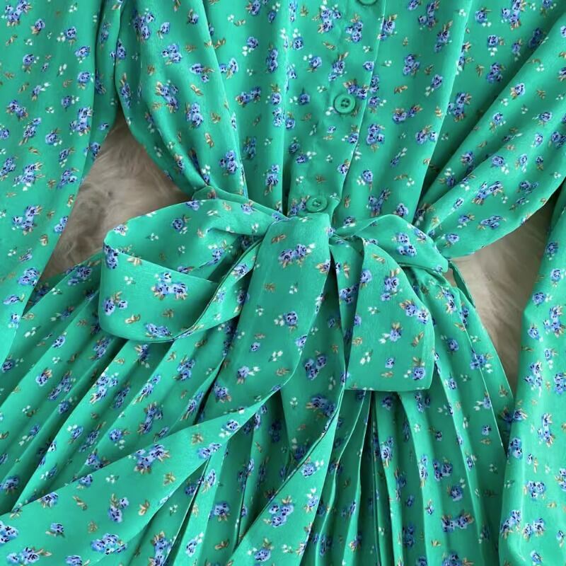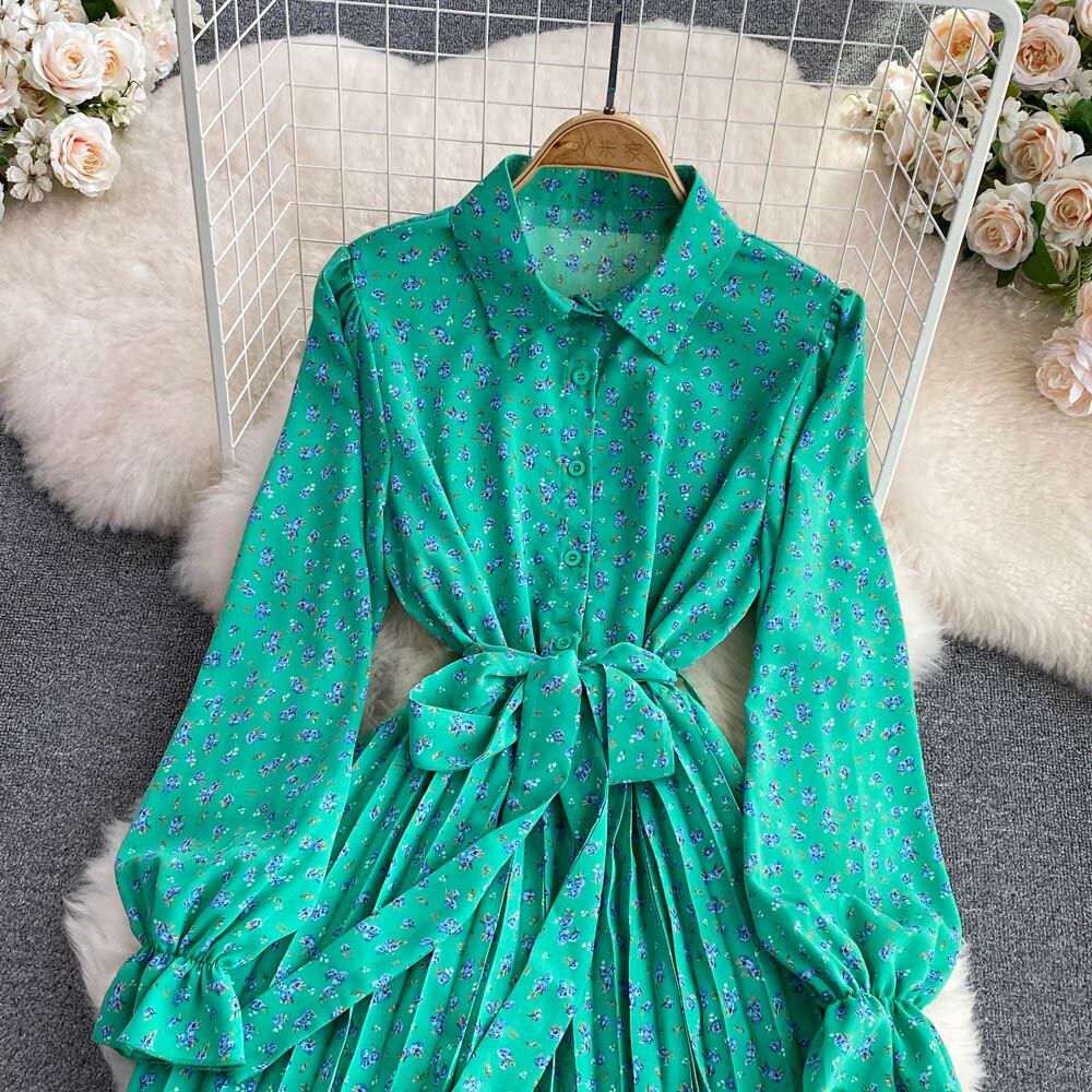 大きスイングラペルネック長袖ウエストラップショー薄いプリント花柄プリーツドレス Vestidos デ シャツ ロング