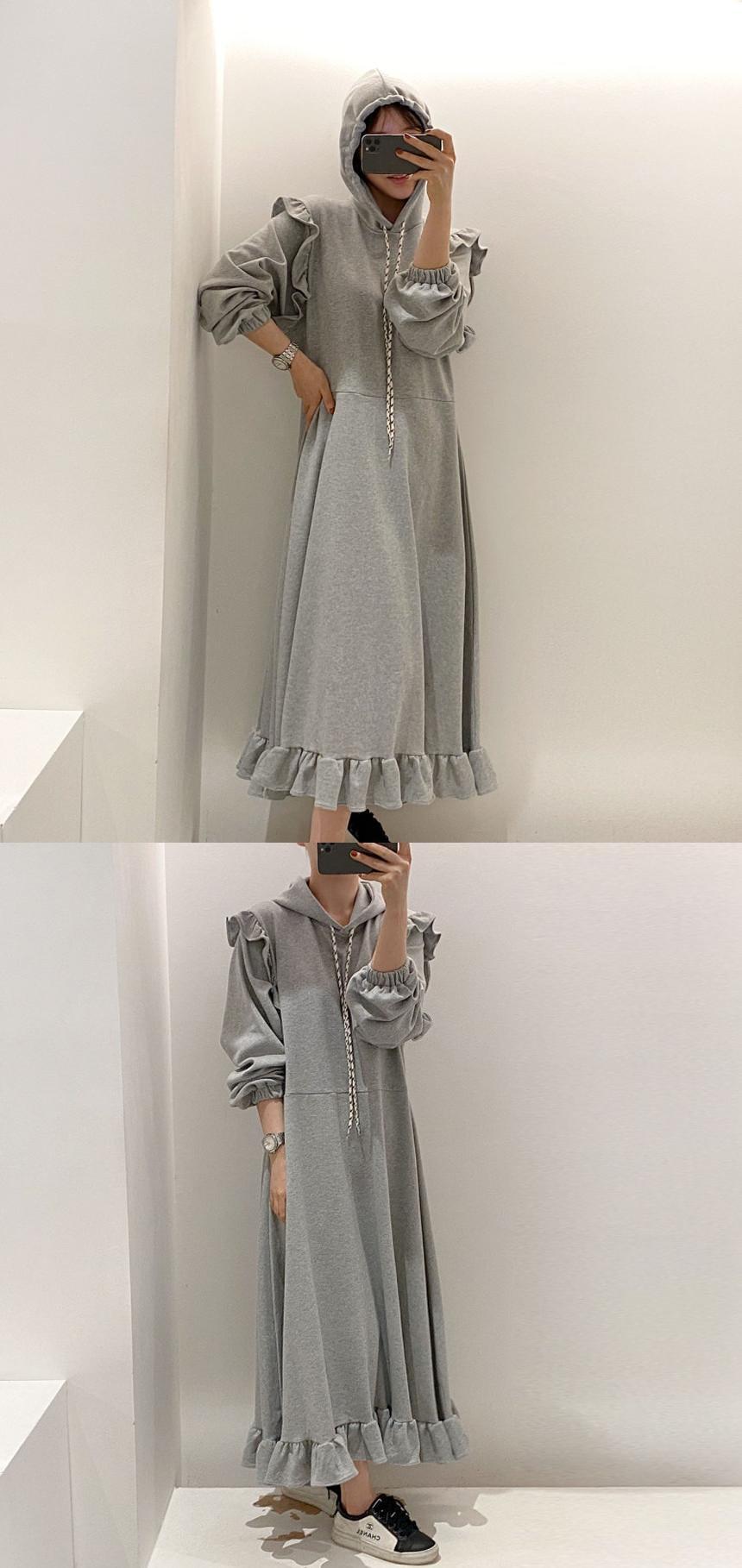 黒フード付きフリルロングセータードレス Vestidos デマキシグレーパーカードレス秋冬 ブラック オータム 秋物 ウィンター 冬物