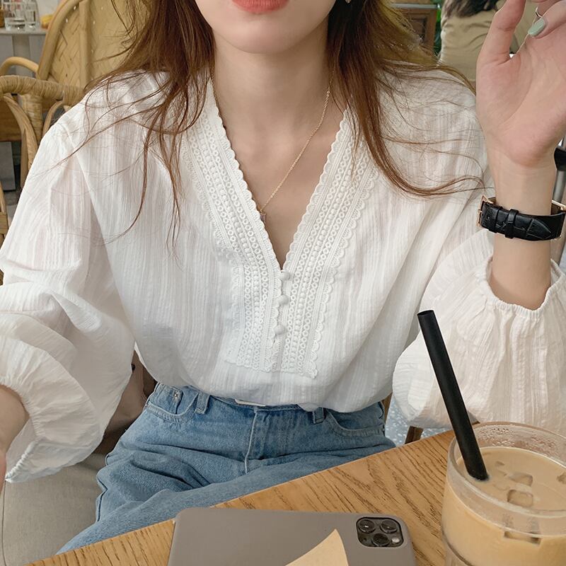 ルーズ パフ パレス スタイル ホワイト シャツ 長袖 トップ De Moda Verano es Y2k レース シャツ ロング