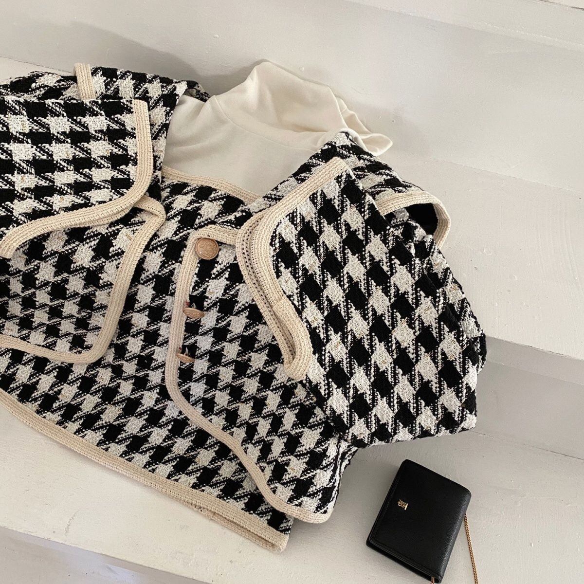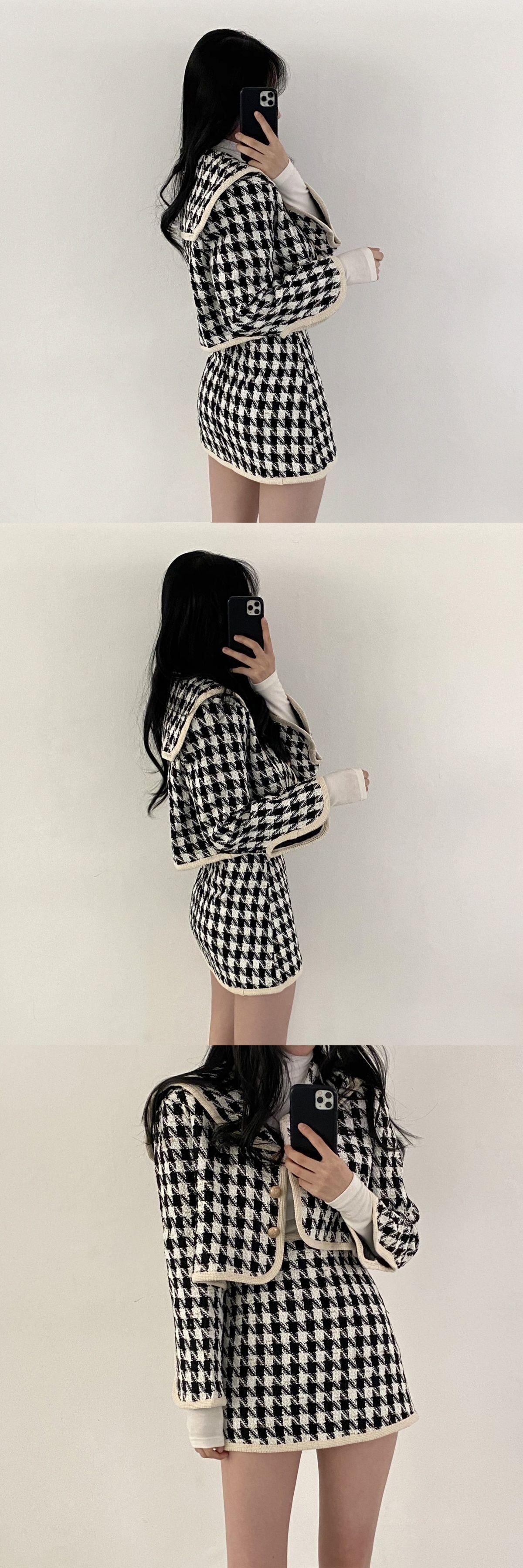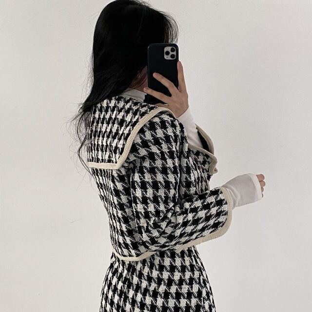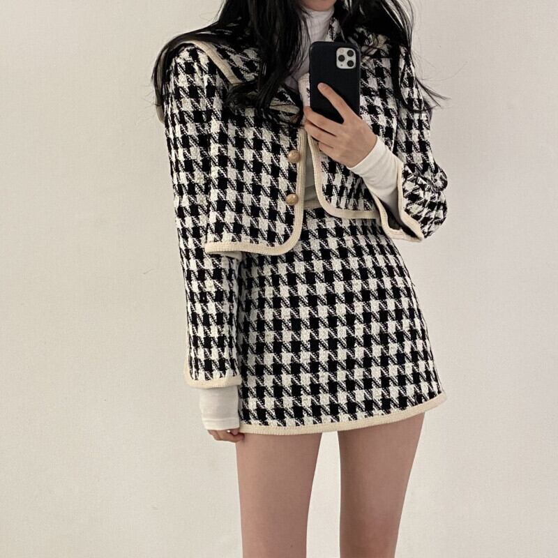 スカートスーツ春秋ショート千鳥格子ジャケットウエストヒップラップスカートウールコート Y2k スカートセットツーピース スプリング 春物 オータム 秋物