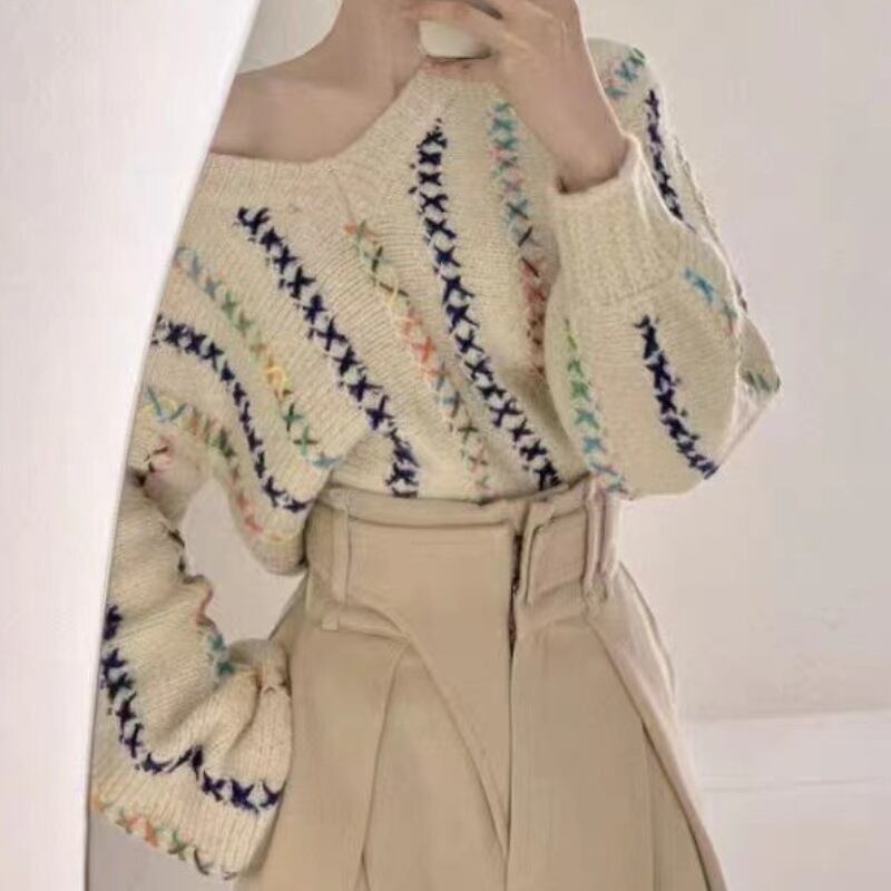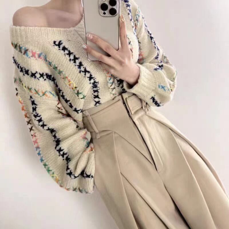 セーター特大セーター巾着プルトップスプルオーバー秋冬 V ネックニットセータートップス服 オータム 秋物 ウィンター 冬物 Vネック