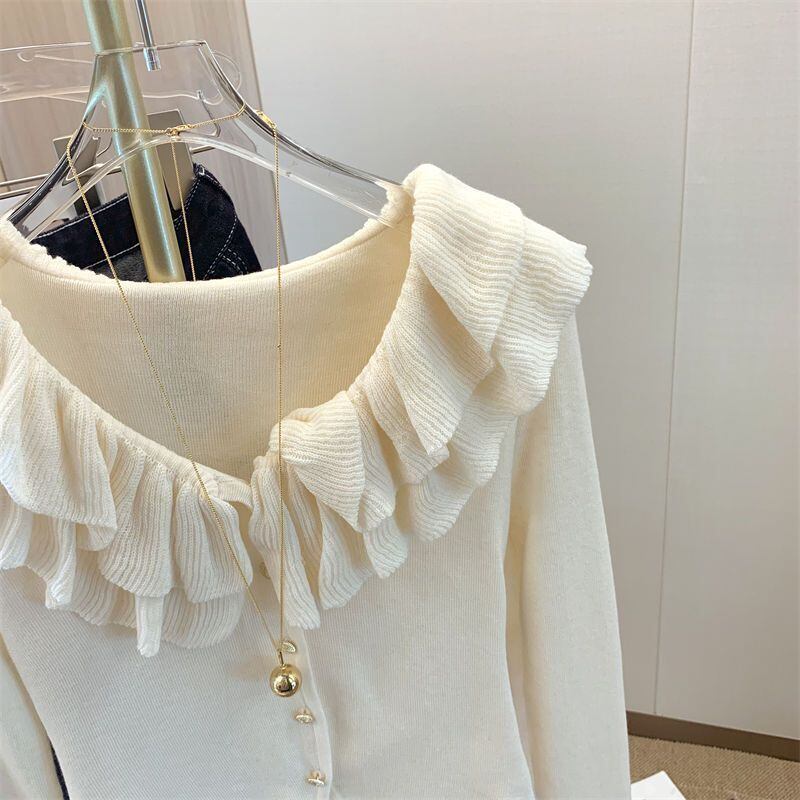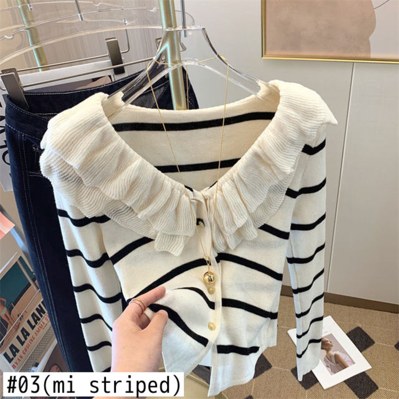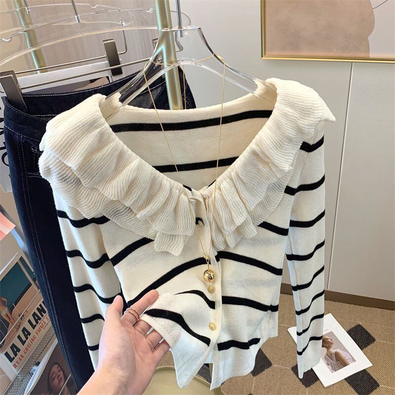 スリムショート長袖トップフレンチフリルスタイルニットカーディガンY2kセーターVネック生き抜く黒ストライプセータートップ ロング ブラック