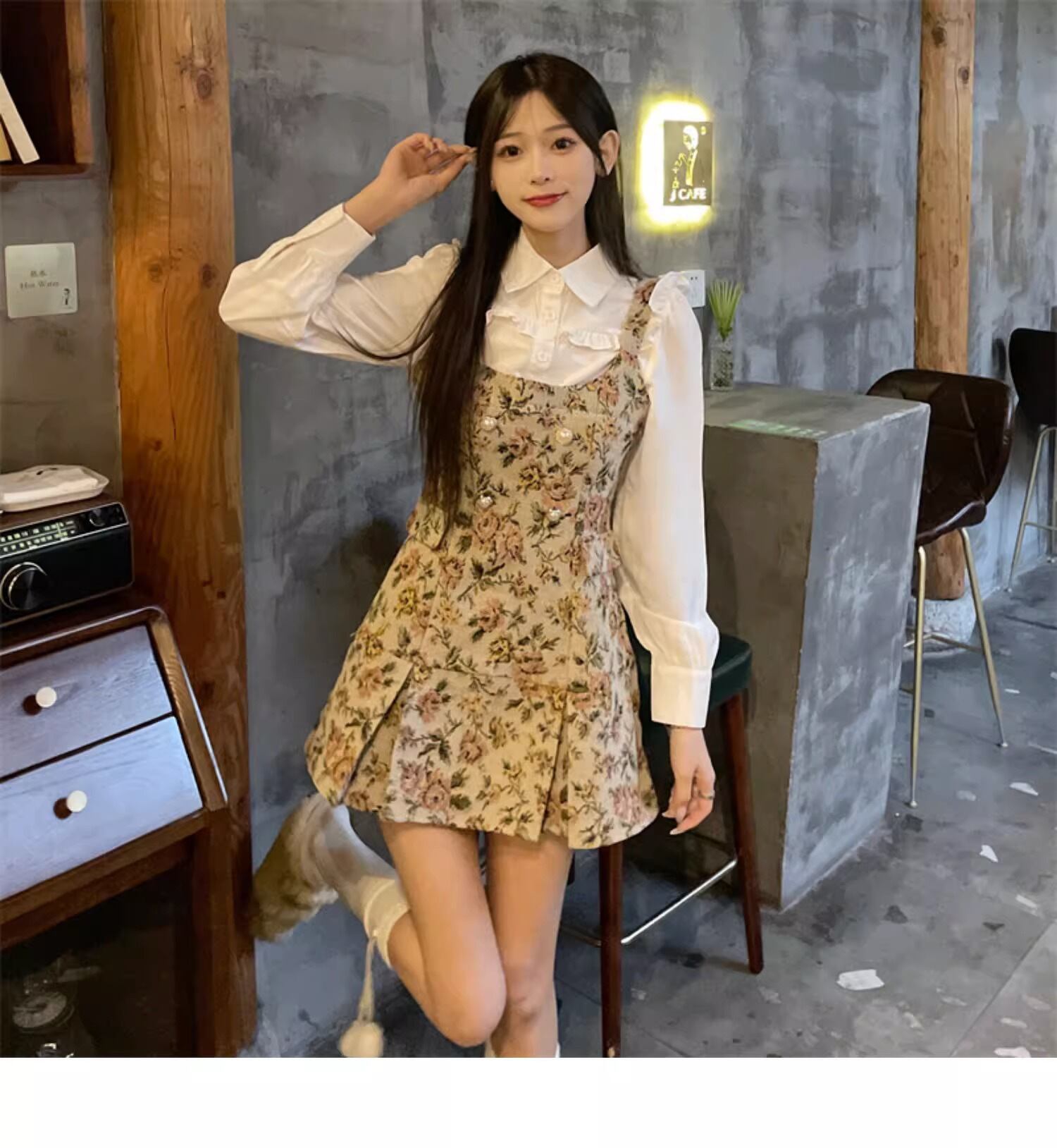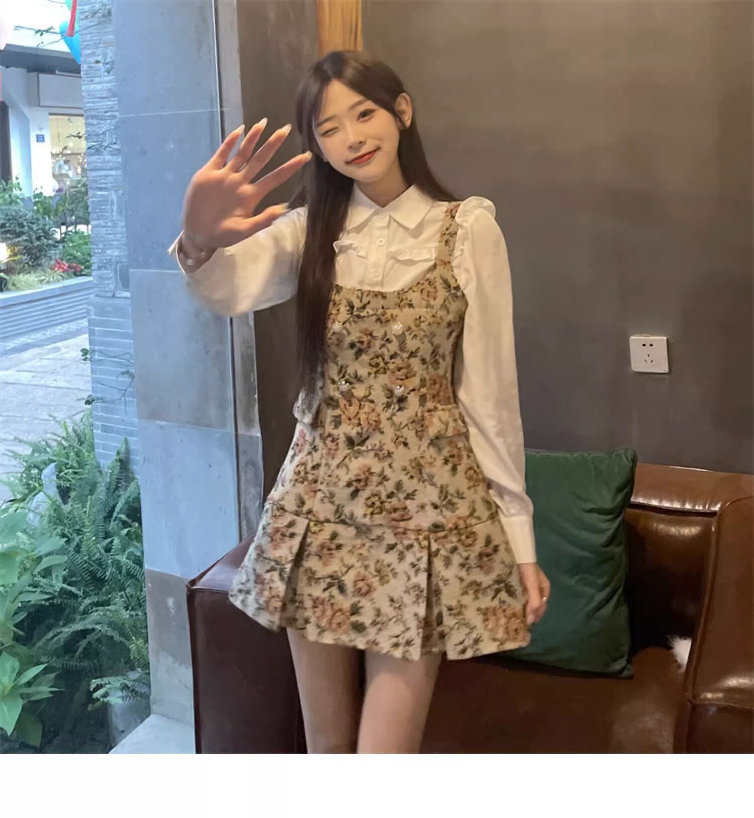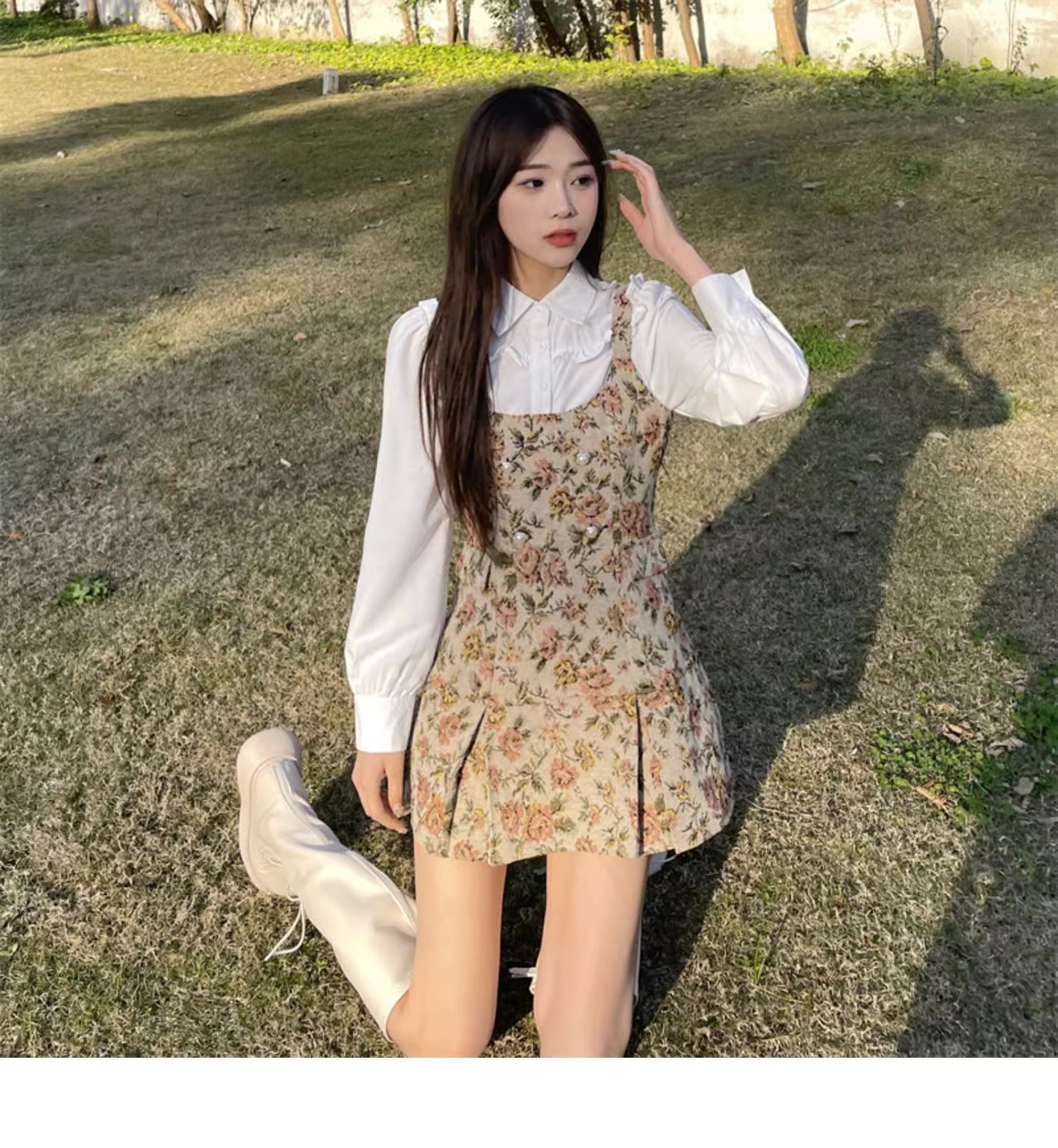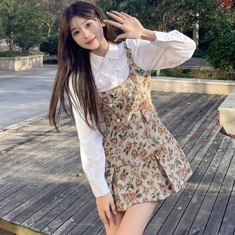 ボディコン Vestidos エス パラ ショート フェイク ツーピース長袖花柄ドレス フリル白シャツ セクシー ドレス ロング ホワイト