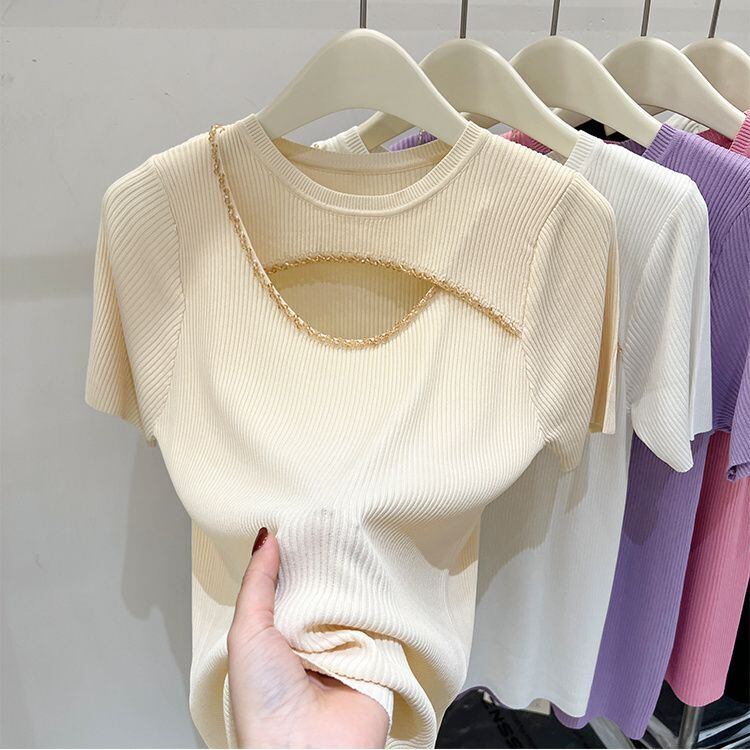シャツ春夏ダイヤモンド中空クロップトップニットグラフィック Tシャツ Y2k トップ半袖セーターグランジ Tシャツ ショート ハーフスリーブ スプリング 春物 サマー 夏物