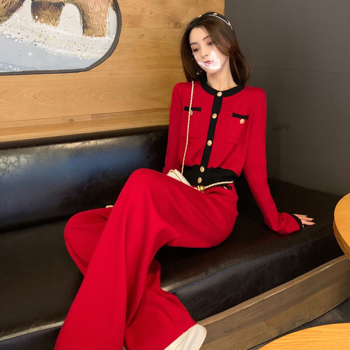 小さ香りスタイルクリスマスレッドセータークロップカーディガントップスニットパンツ 2 ピースセットトラックスーツコート秋 オータム 秋物