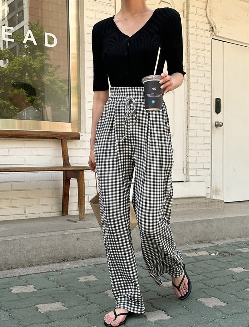 ワイドレッグパンツ黒、白チェックパンツだぶだぶウエストスウェットパンツ原宿ズボンカーゴパンツ Pantalones ホワイト ブラック かわいい ワイドパンツ