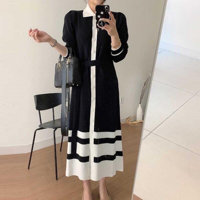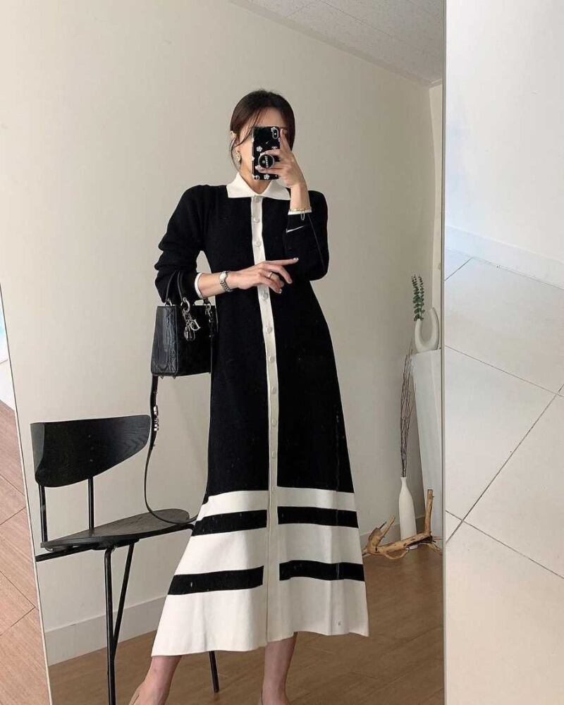 Vestidos デシングルブレストコントラストスリムニットロングドレスローブスリーブ A ラインセータードレスボディコン秋 オータム 秋物 Aライン