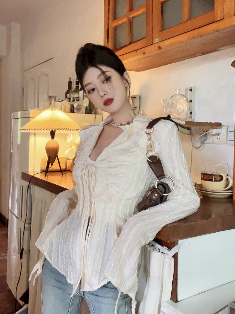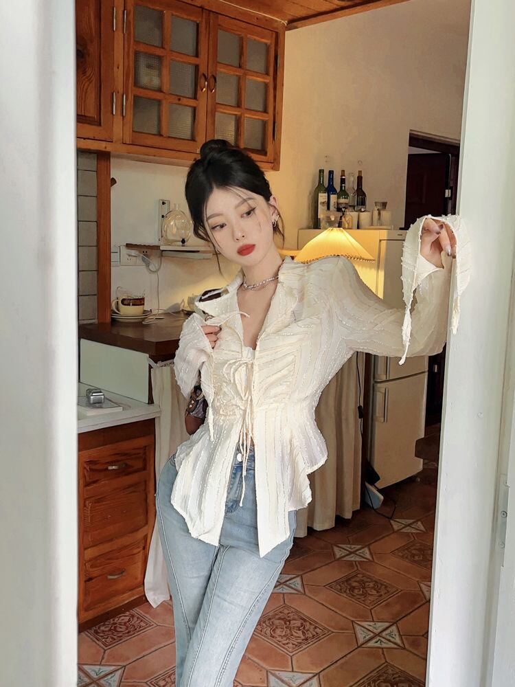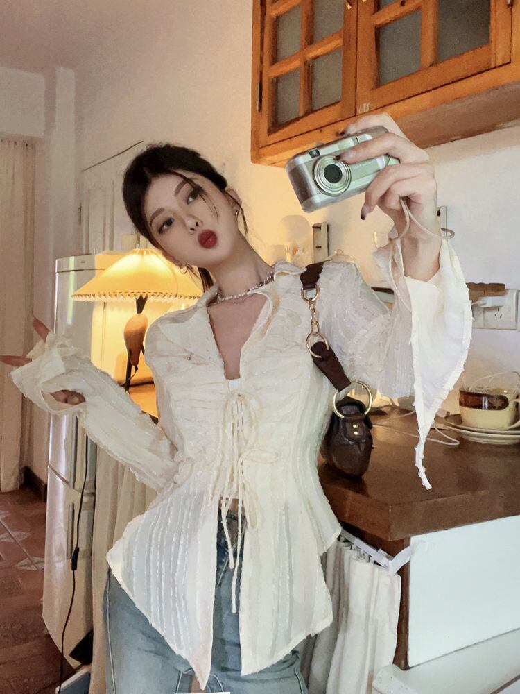 Y2K ボタンダウンシャツブラウスシースルーフレアスリーブクロップトップ E- ストリート白シャツレースアップ ホワイト