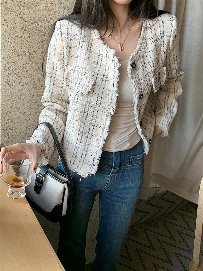 気質レトロショートツイード小さ香りコートスリムチャケータスタイルストライプジャケットトップス
