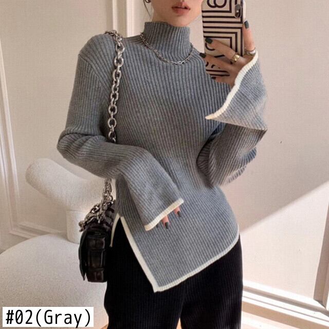 タートルネック セーター ブラック プルオーバー 冬 サイド スリット ニット セーター ロング フレア スリーブ ニット トップス フレアスリーブ ウィンター 冬物