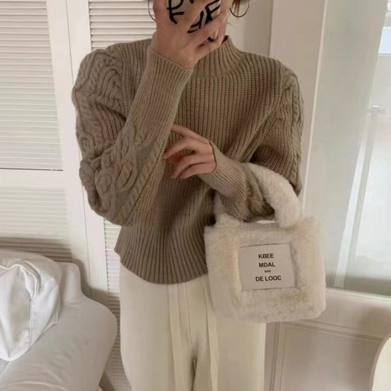 ニットハーフネックセーターキャンディカラーパフスリーブスウィートピンクツイストセータージャージセーター生き抜くトップス 大人ガーリー キュート カジュアル