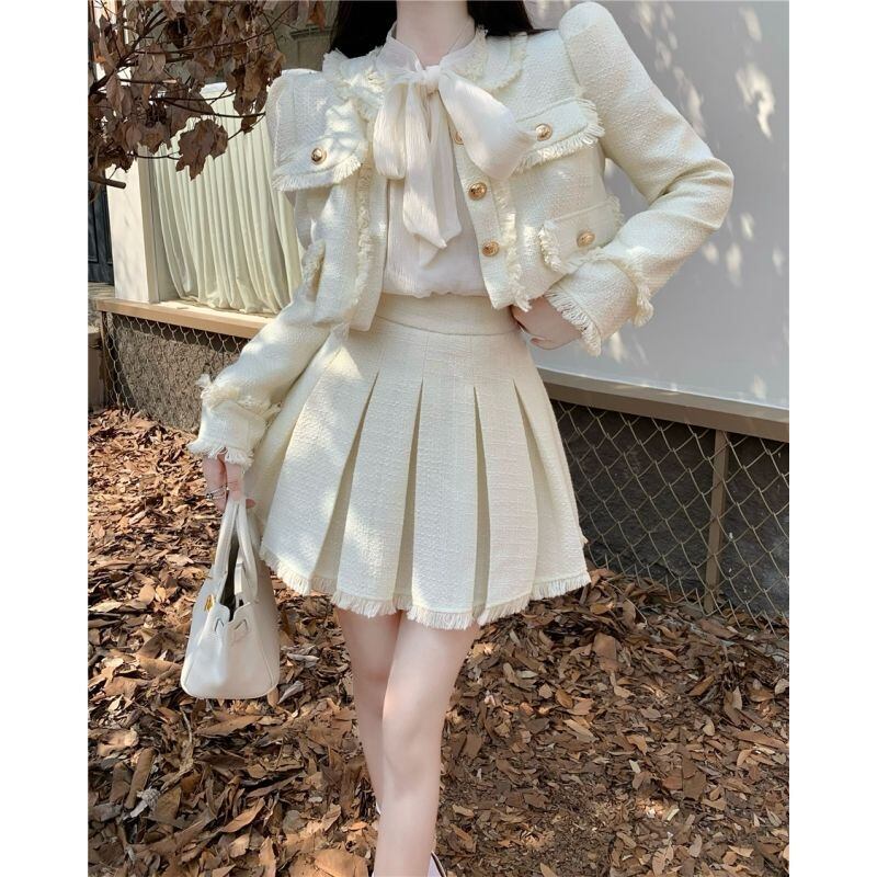 フランス小さフレグランス 2 点セットショートジャケットコートトップスプリーツスカートスーツ高級 2 点セット