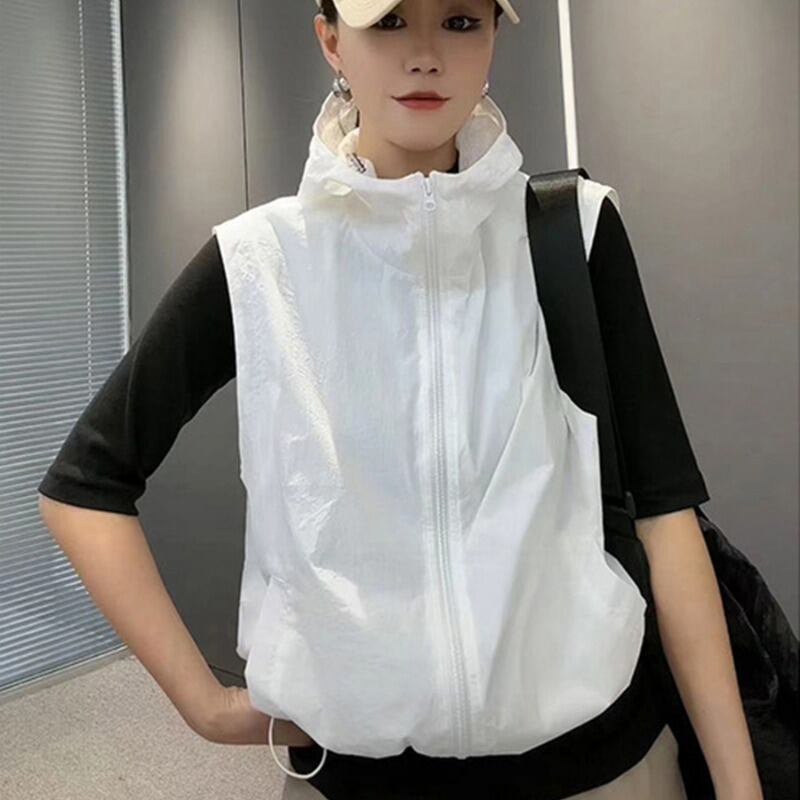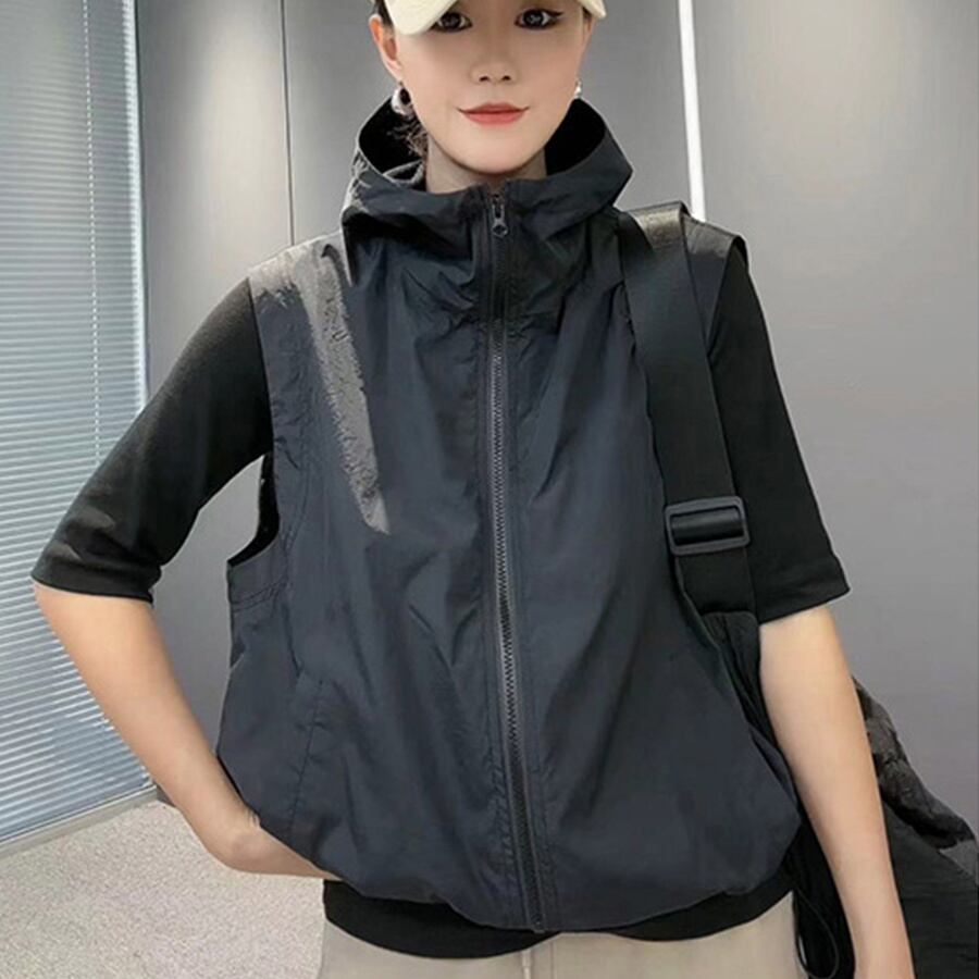 フード付きベストノースリーブカーディガンジッパーアウトドアジャケットスウェットトップソリッドシャツ ソリッドカラー