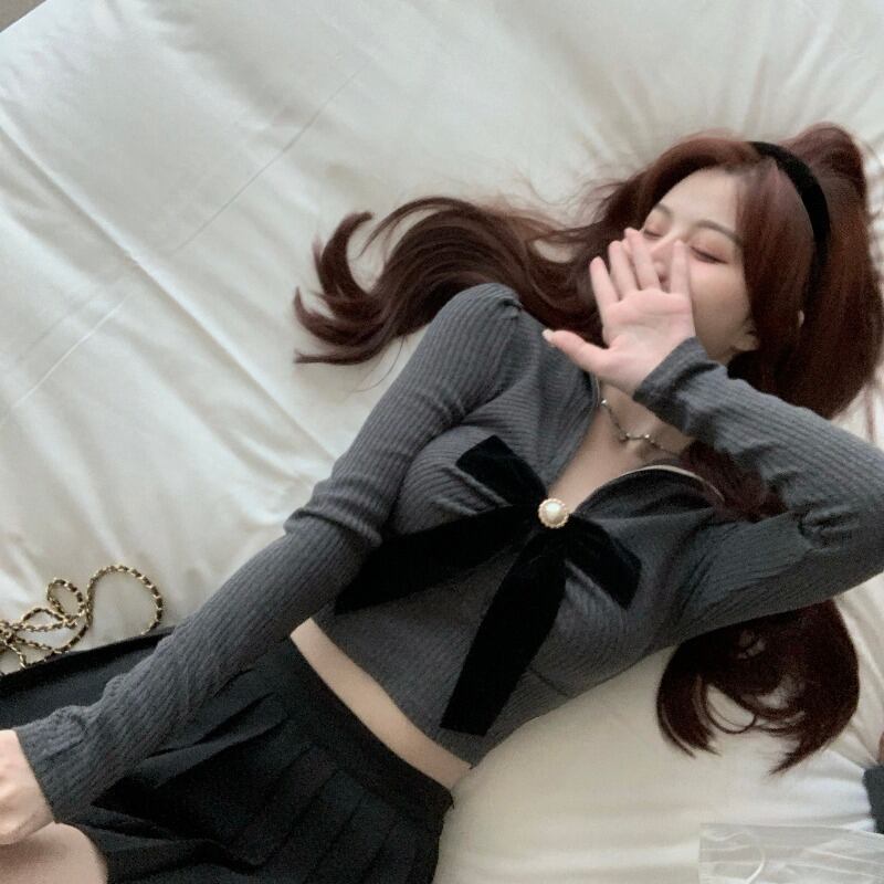 グレーショートトップ長袖弓セータージャンパープルオーバーセーターグランジ Y2k セーターセクシーボトムトップスシャツ ロング リボン